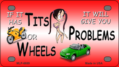 Tits Or Wheels Problems Novelty Mini Metal License Plate Tag. 2.2" x 4" high gloss novelty mini metal license plate tag. Made of the highest quality aluminum for a weather resistant finish. It is lightweight and durable. Pre-drilled holes for quick and easy mounting on any vehicle, or add a ribbon, wire or string to instantly turn this license plate into a sign and display it on a wall or door. Individually shrink-wrapped and proudly made in the USA.