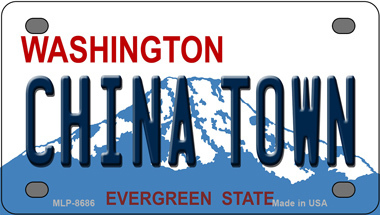 China Town Washington Novelty Mini Metal License Plate Tag. 2.2" x 4" high gloss novelty mini metal license plate tag. Made of the highest quality aluminum for a weather resistant finish. It is lightweight and durable. Pre-drilled holes for quick and easy mounting on any vehicle, or add a ribbon, wire or string to instantly turn this license plate into a sign and display it on a wall or door. Individually shrink-wrapped and proudly made in the USA.