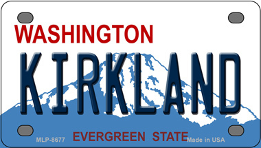 Kirkland Washington Novelty Mini Metal License Plate Tag. 2.2" x 4" high gloss novelty mini metal license plate tag. Made of the highest quality aluminum for a weather resistant finish. It is lightweight and durable. Pre-drilled holes for quick and easy mounting on any vehicle, or add a ribbon, wire or string to instantly turn this license plate into a sign and display it on a wall or door. Individually shrink-wrapped and proudly made in the USA.