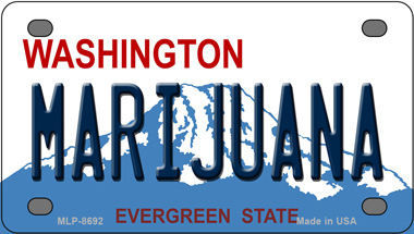 Marijuana Washington Novelty Mini Metal License Plate Tag. 2.2" x 4" high gloss novelty mini metal license plate tag. Made of the highest quality aluminum for a weather resistant finish. It is lightweight and durable. Pre-drilled holes for quick and easy mounting on any vehicle, or add a ribbon, wire or string to instantly turn this license plate into a sign and display it on a wall or door. Individually shrink-wrapped and proudly made in the USA.