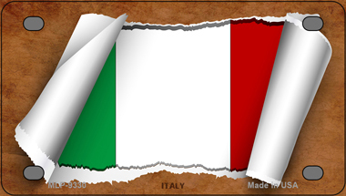 Italy Flag Scroll Novelty Mini Metal License Plate Tag. 2.2" x 4" high gloss novelty mini metal license plate tag. Made of the highest quality aluminum for a weather resistant finish. It is lightweight and durable. Pre-drilled holes for quick and easy mounting on any vehicle, or add a ribbon, wire or string to instantly turn this license plate into a sign and display it on a wall or door. Individually shrink-wrapped and proudly made in the USA.