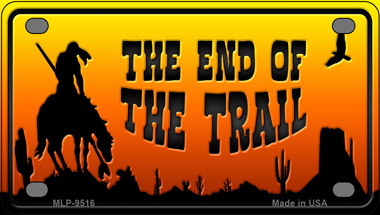End Of Trail Scenic Novelty Mini Metal License Plate Tag. 2.2" x 4" high gloss novelty mini metal license plate tag. Made of the highest quality aluminum for a weather resistant finish. It is lightweight and durable. Pre-drilled holes for quick and easy mounting on any vehicle, or add a ribbon, wire or string to instantly turn this license plate into a sign and display it on a wall or door. Individually shrink-wrapped and proudly made in the USA.