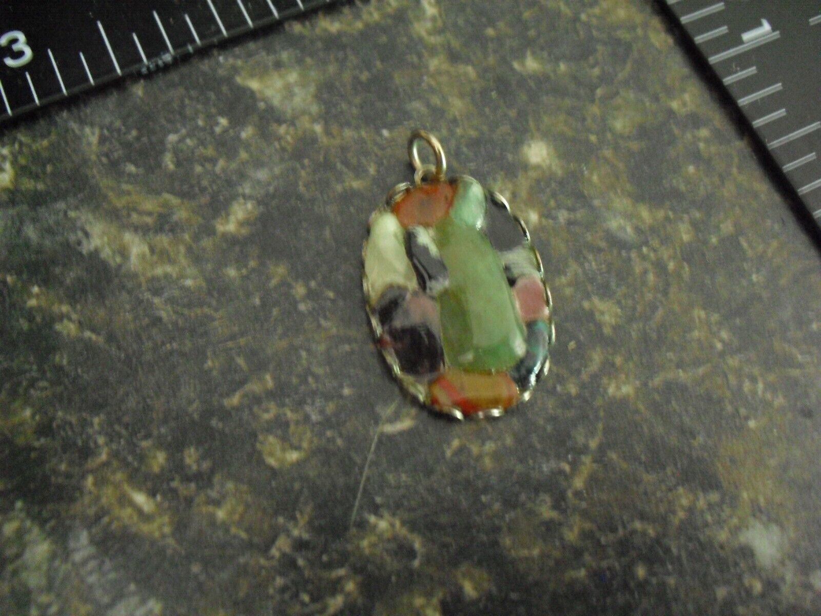 You are bidding on a cool, circa 1970s era, hard to tell, looks older, silver tone metal with what looks like assorted melted glass design on the front, pendant or charm in the picture. 3/4 inches wide. Nice shape with very some light use, light scratches on the back, maybe could use a polishing. Zoom in for condition.