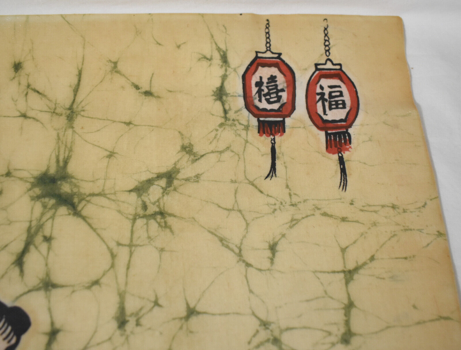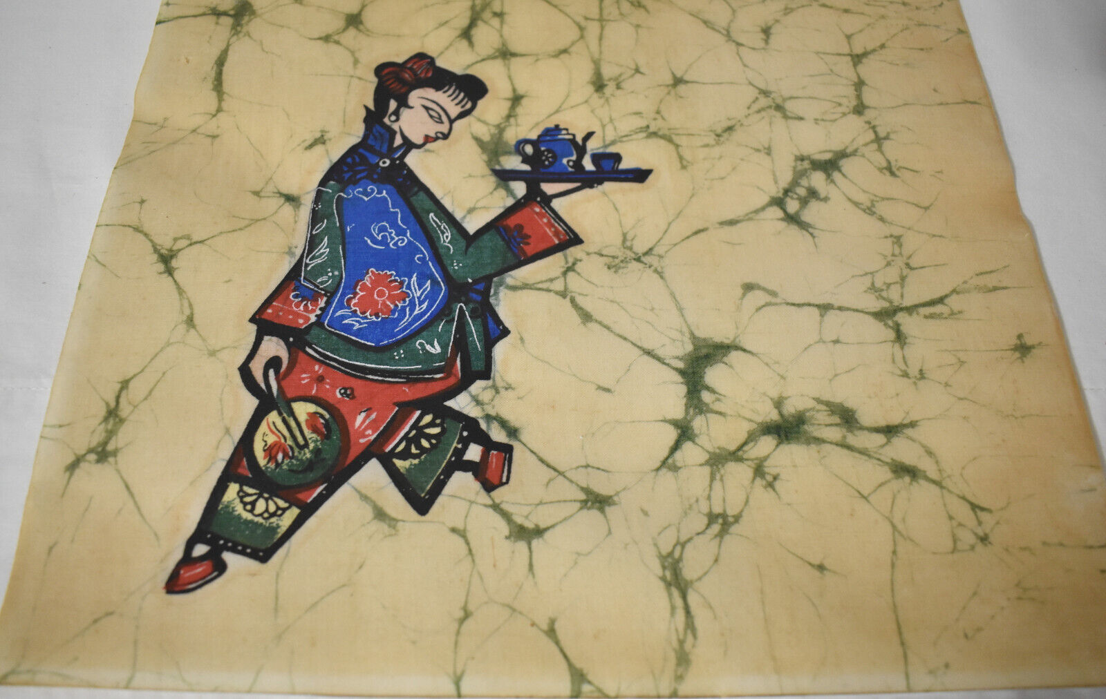Vintage Asian Screen Print on Rice Paper or Linen Tea Time Motif w Calligraphy