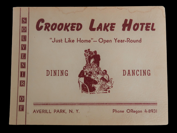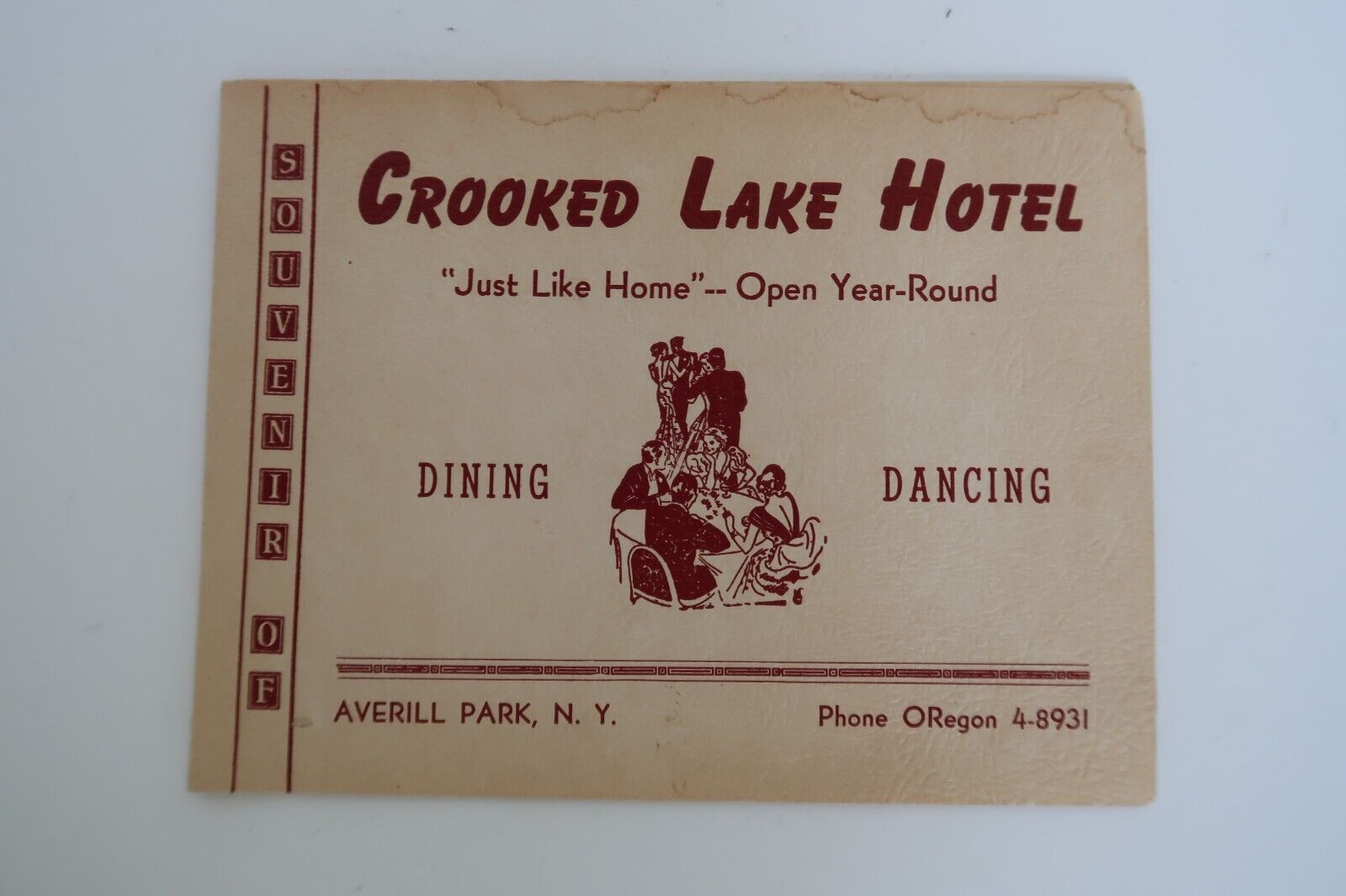 Nice vintage souvenir from Crooked Lake Hotel Dining and Dancing in Averill Park, NY. Some water stains on the outside envelope, please see the photos.