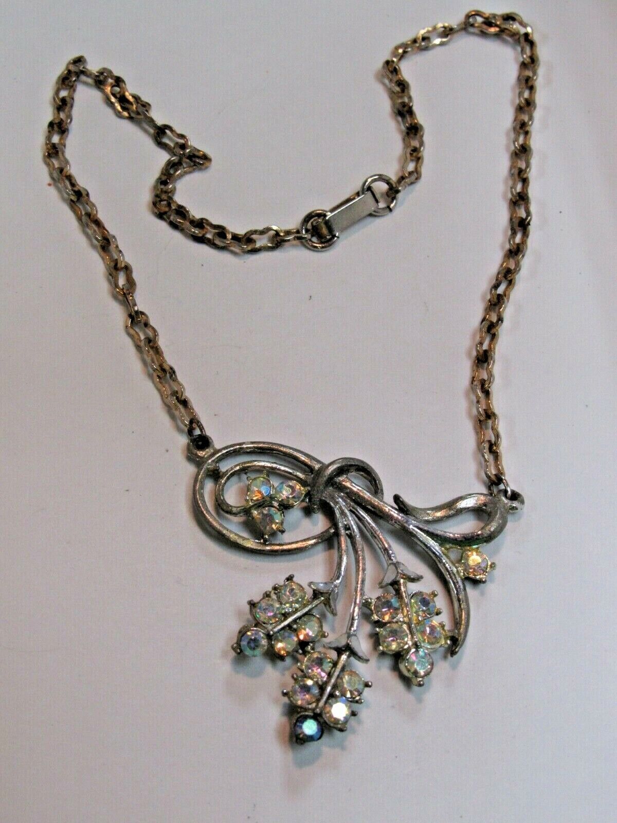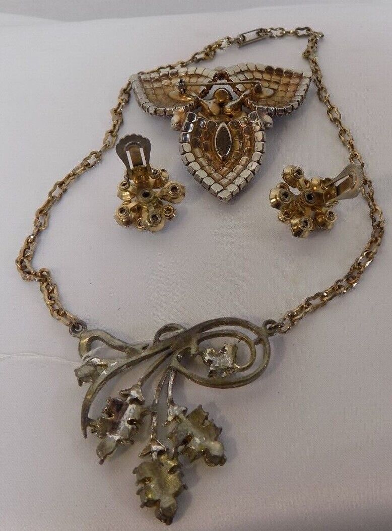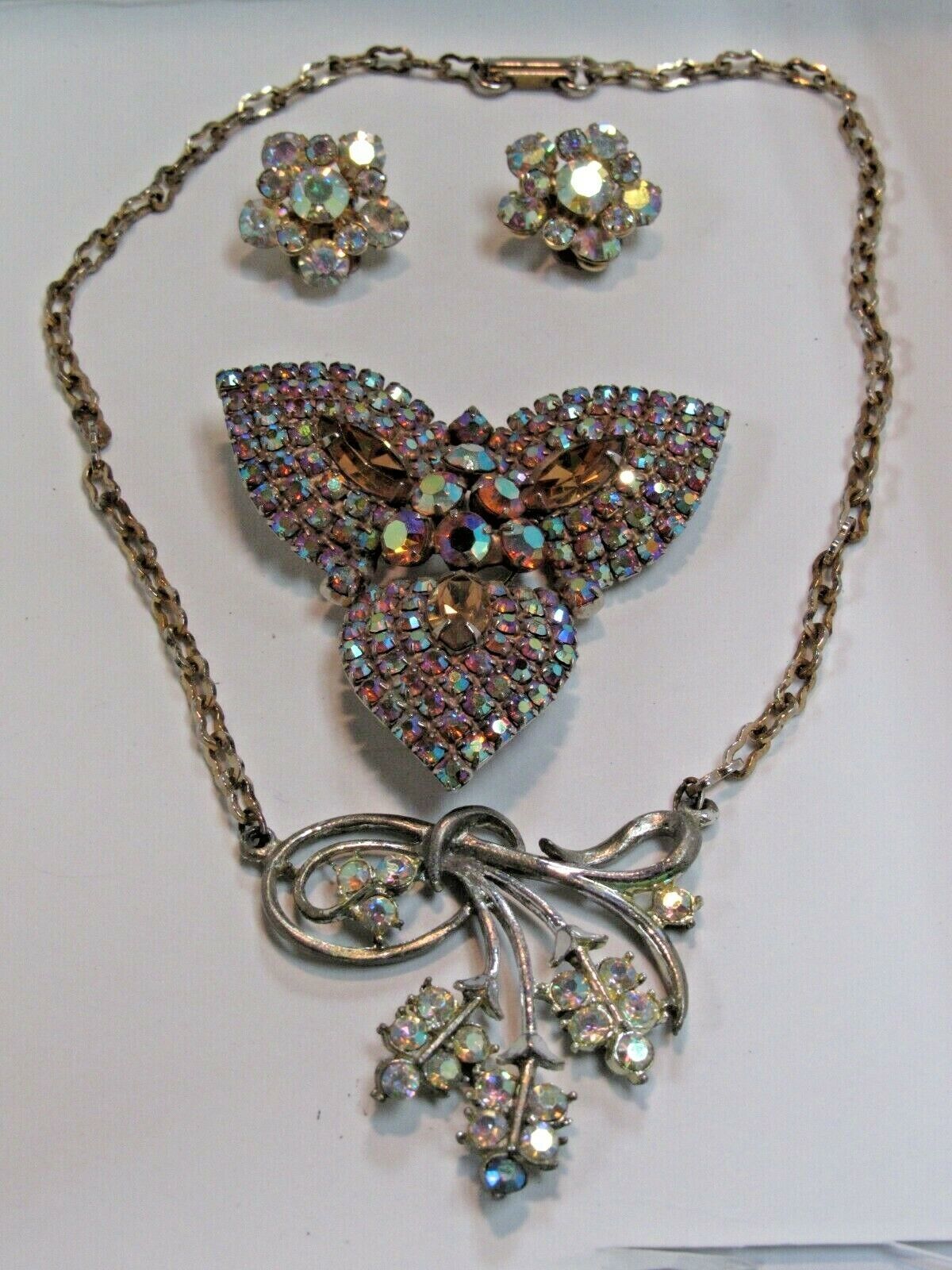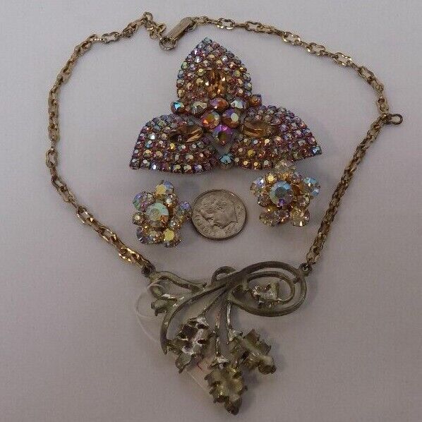 Here at Debi's Attic Gold in Wewoka, Oklahoma we have a Vintage 4 Piece Set Aurora Borealis Crystal Jewelry Brooch, Necklace Earrings. They are in good condition, may have light scratches. Sold AS IS