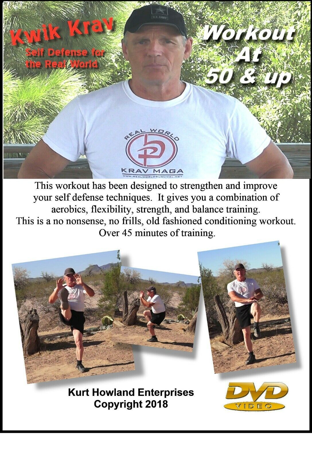"THE KRAV MAGA WORKOUT" at 50 years old up This workout has been designed by instructor Kurt Howland to strengthen and improve your self defense techniques. It gives you a combination of aerobics, flexibility, strength, and balance training. This is a no nonsense, no frills, old fashioned conditioning workout. This 15 minute per day, 3 day routine will get you ready to defend yourself with confidence.