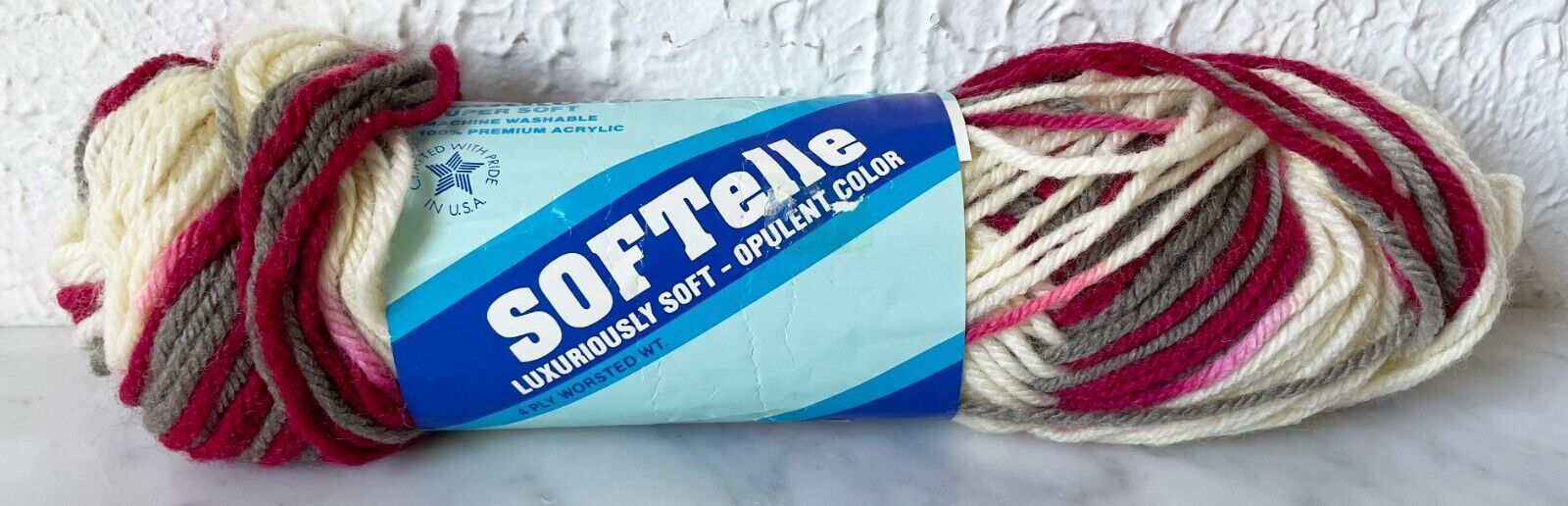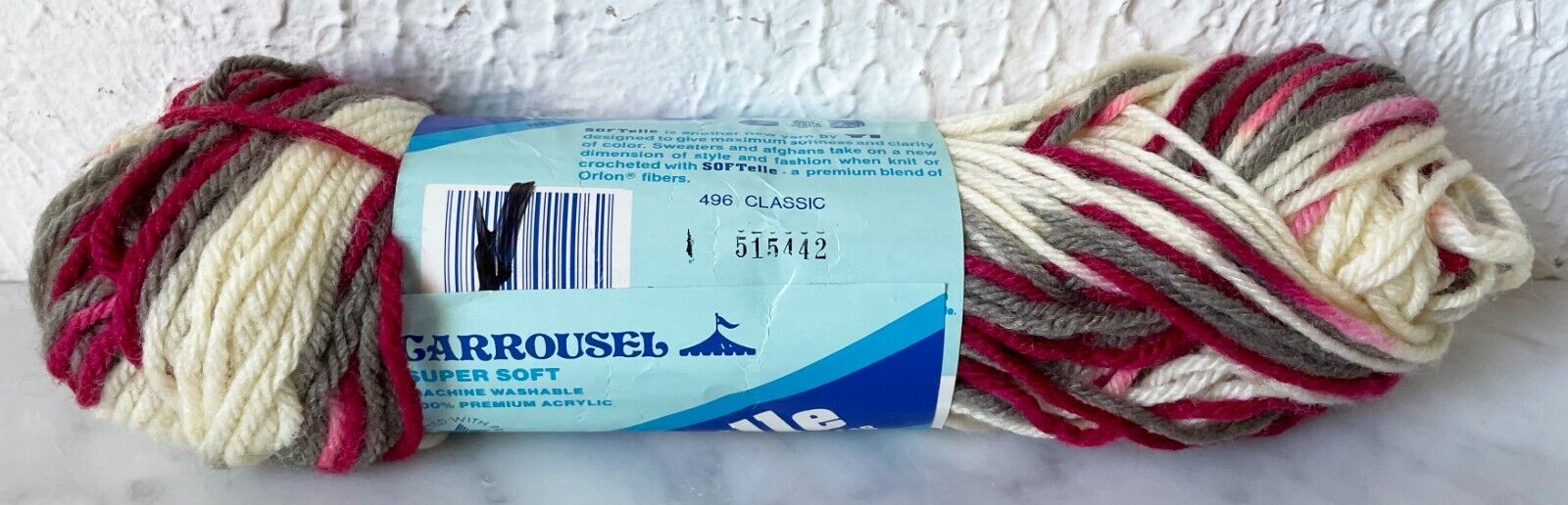One skein of Carrousel Softelle ombre worsted yarn. Color Classic #496: Wine, Grey Pink, Ivory. 100% Orlon Acrylic; machine washable and dryable. Made in USA.