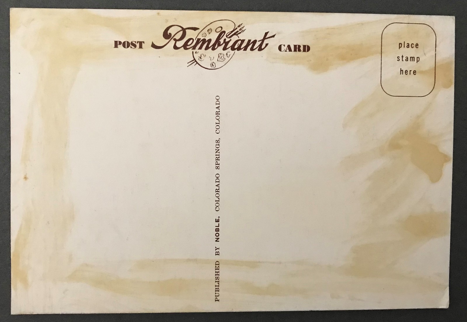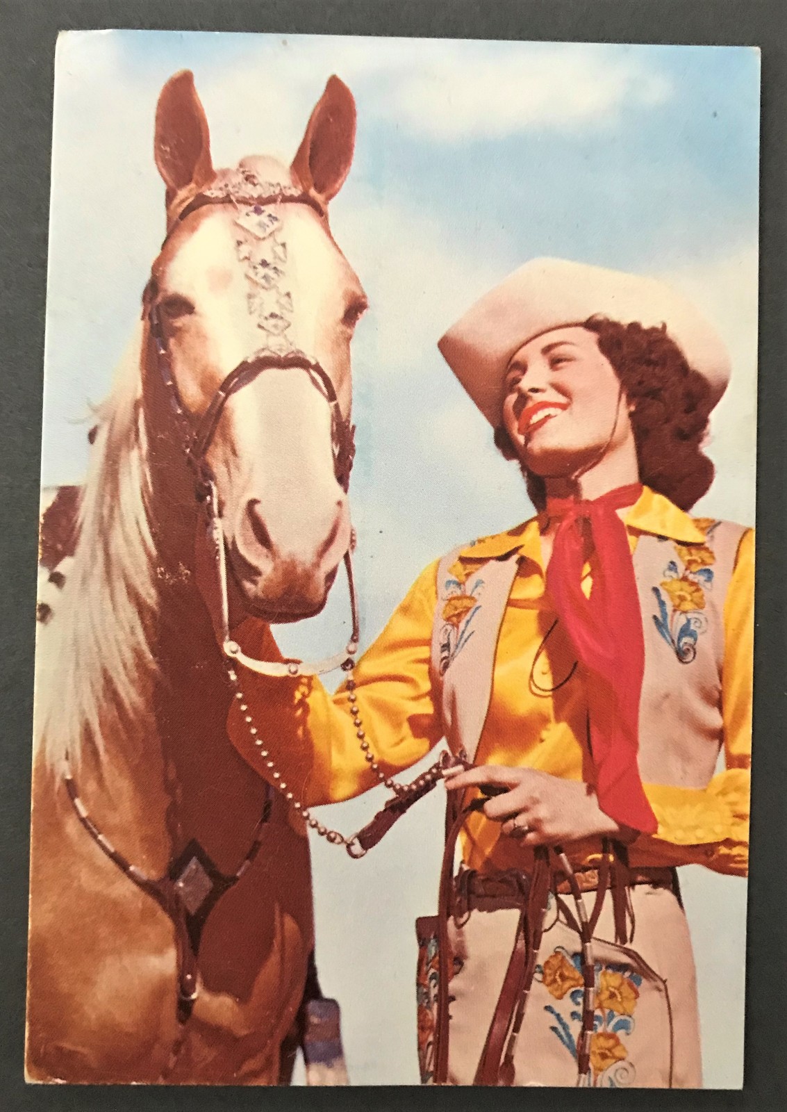 What A terrific image from the 1950's! What a great reminder of a simpler and fun time in America. Hey, who doesn't like a pretty Cowgirl with a beautiful horse? However, this postcard also has some brownish staining on its backside. It's not something that has warped it at all but sadly it makes it a bit less than perfect.