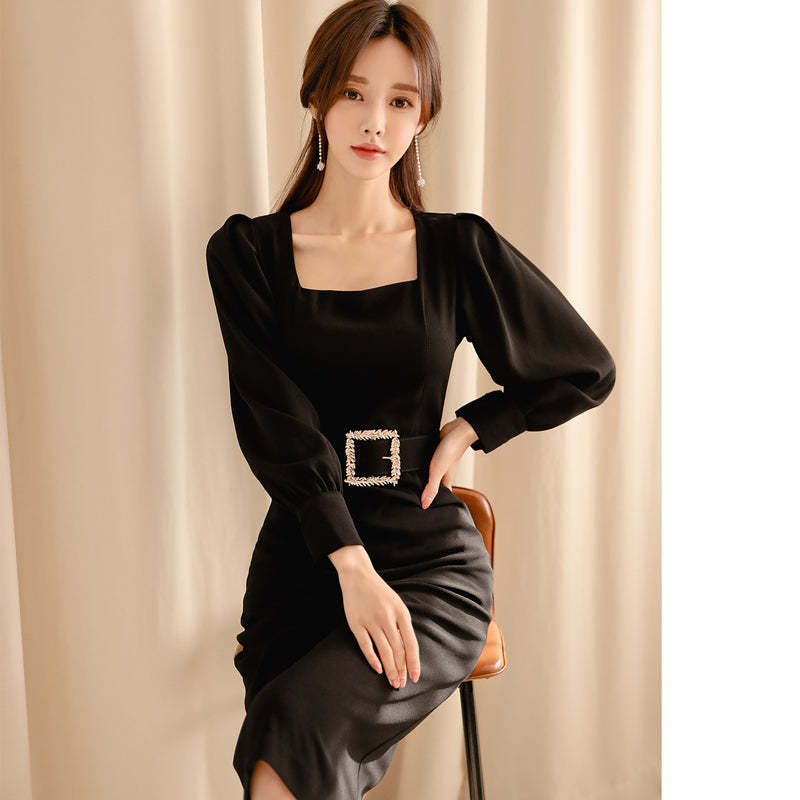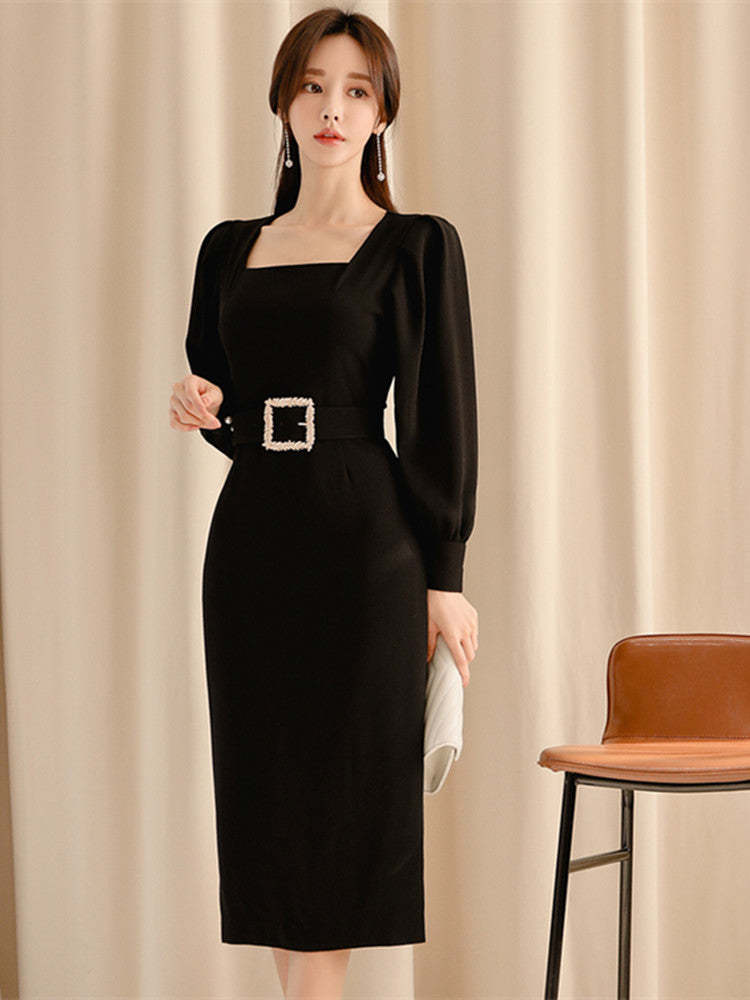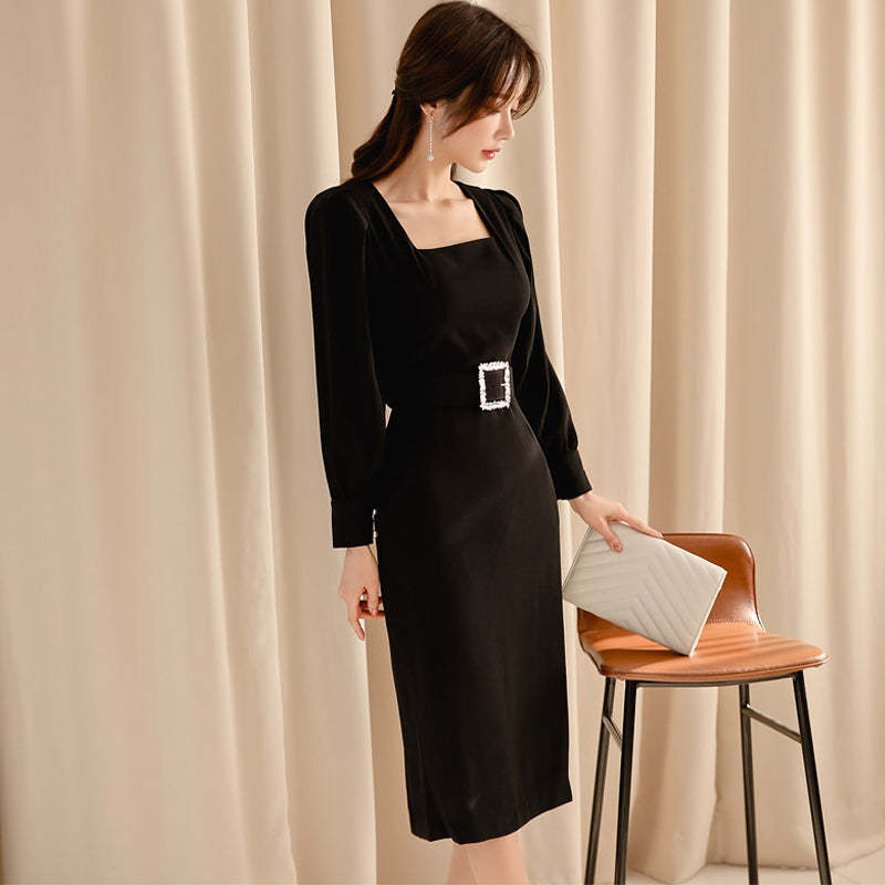 Vintage Black Sashes Long Sleeve Bodycon Dress