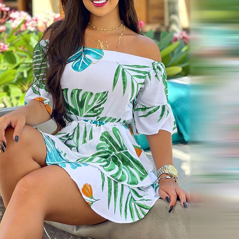 Off Shoulder Palm Leaf Print Casual Dress