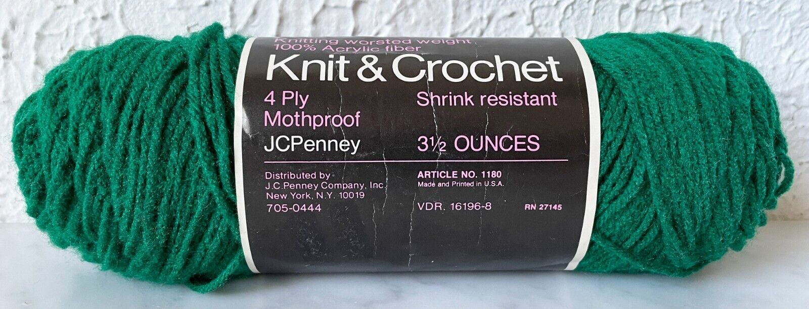 One skein of vintage JC Penney Knit Crochet 4 ply worsted weight yarn. Color Dark Green #752. 100% Acrylic, machine wash and dry. Made in USA.