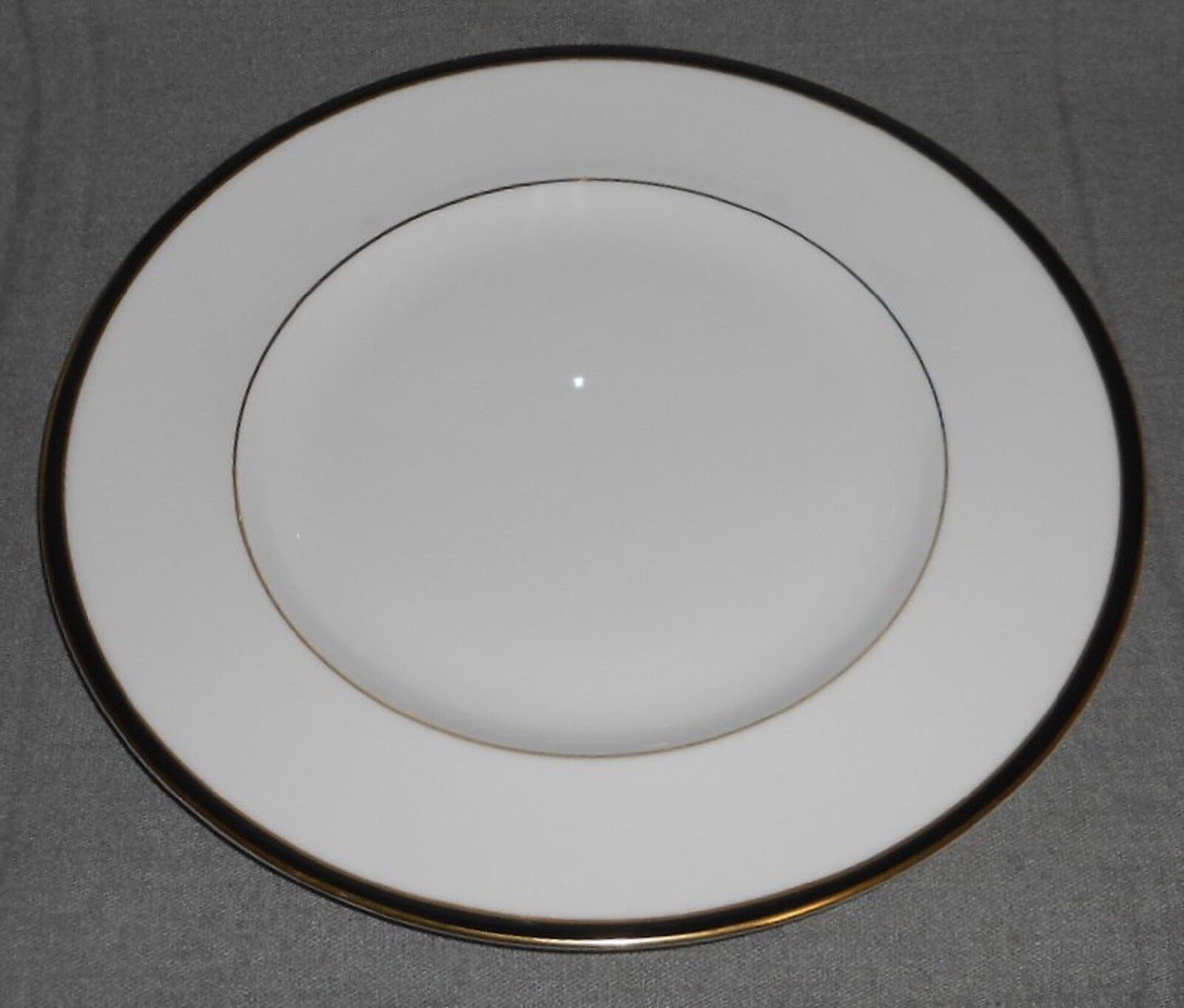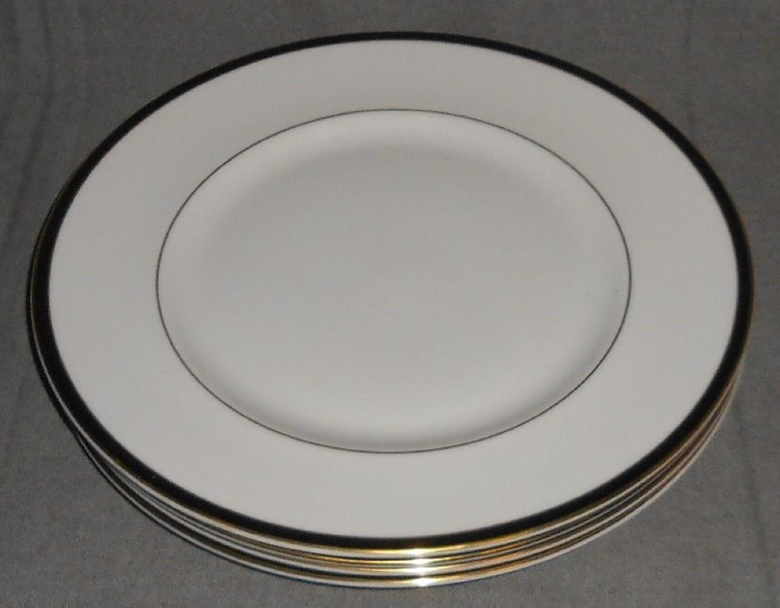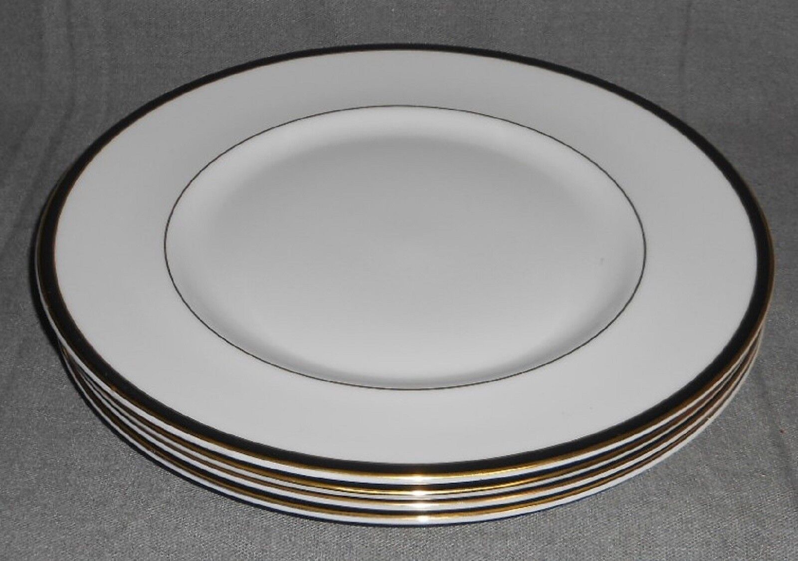 This is a Set of (4) 10 3/4" Dinner Plates that are copyrighted 1983 Royal Doulton Tableware and Made for Minton in the Fine Bone China Saturn Pattern with the Classic Elegant White with Gold and Black Trim Design. They are all in great pre-owned condition with no chips or damage and gold rim is vibrant in color with no wear.