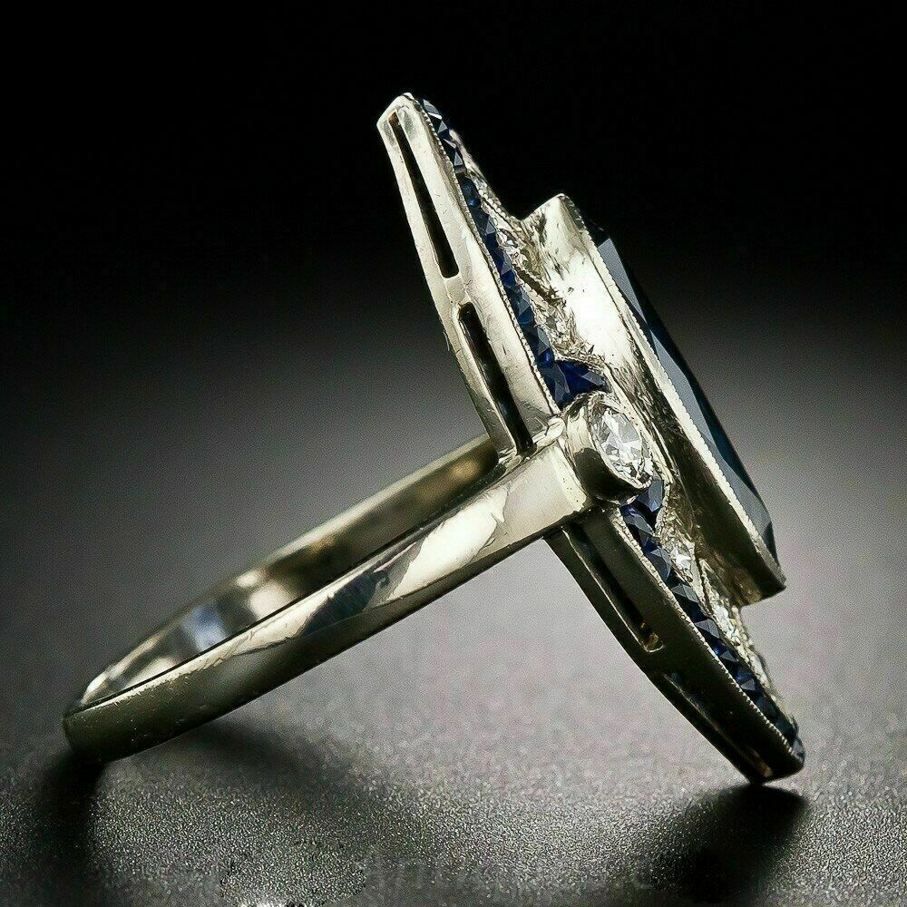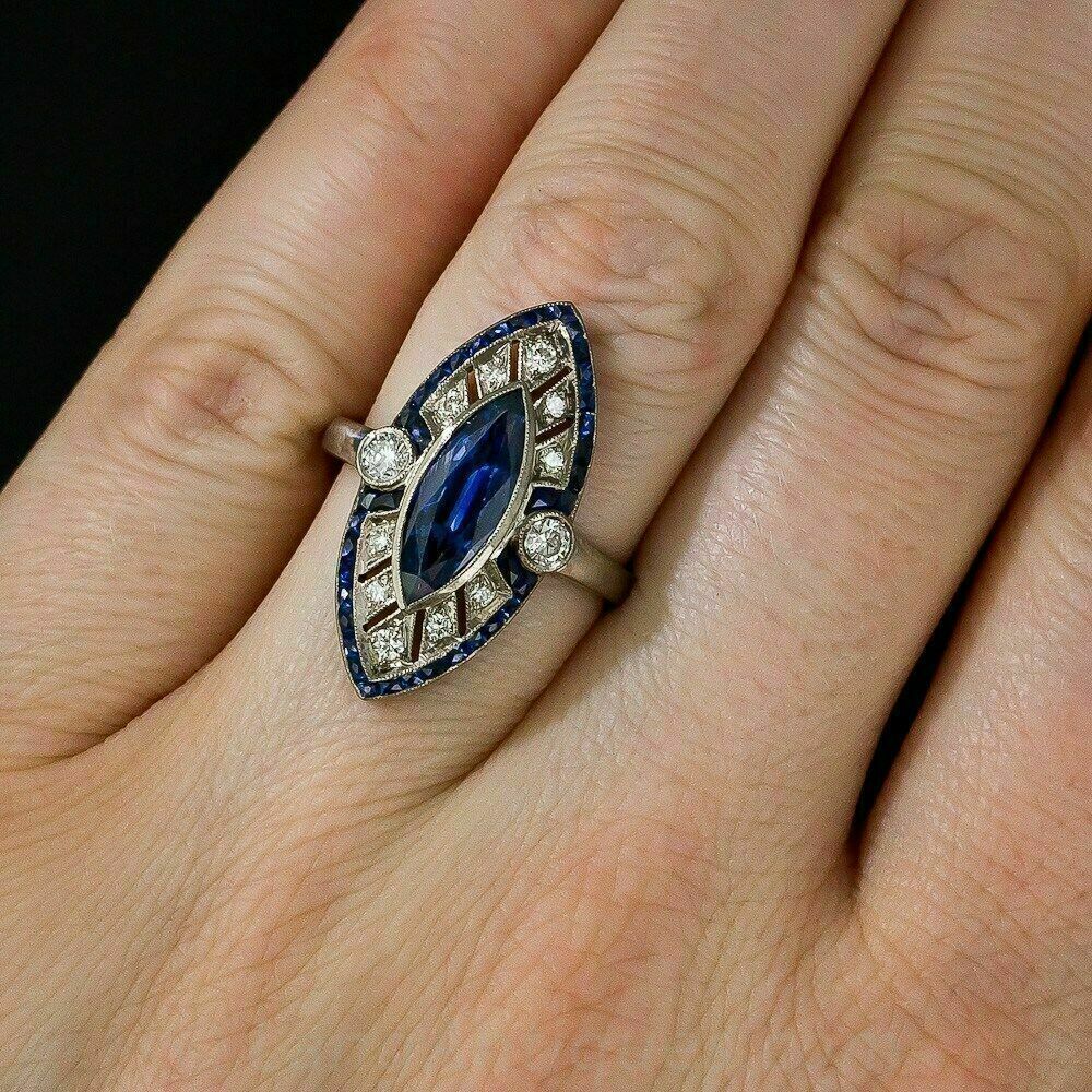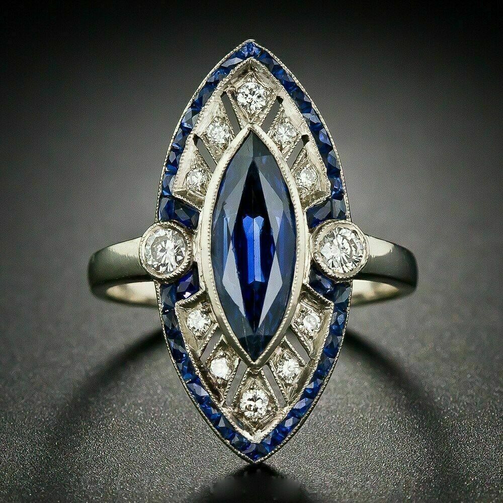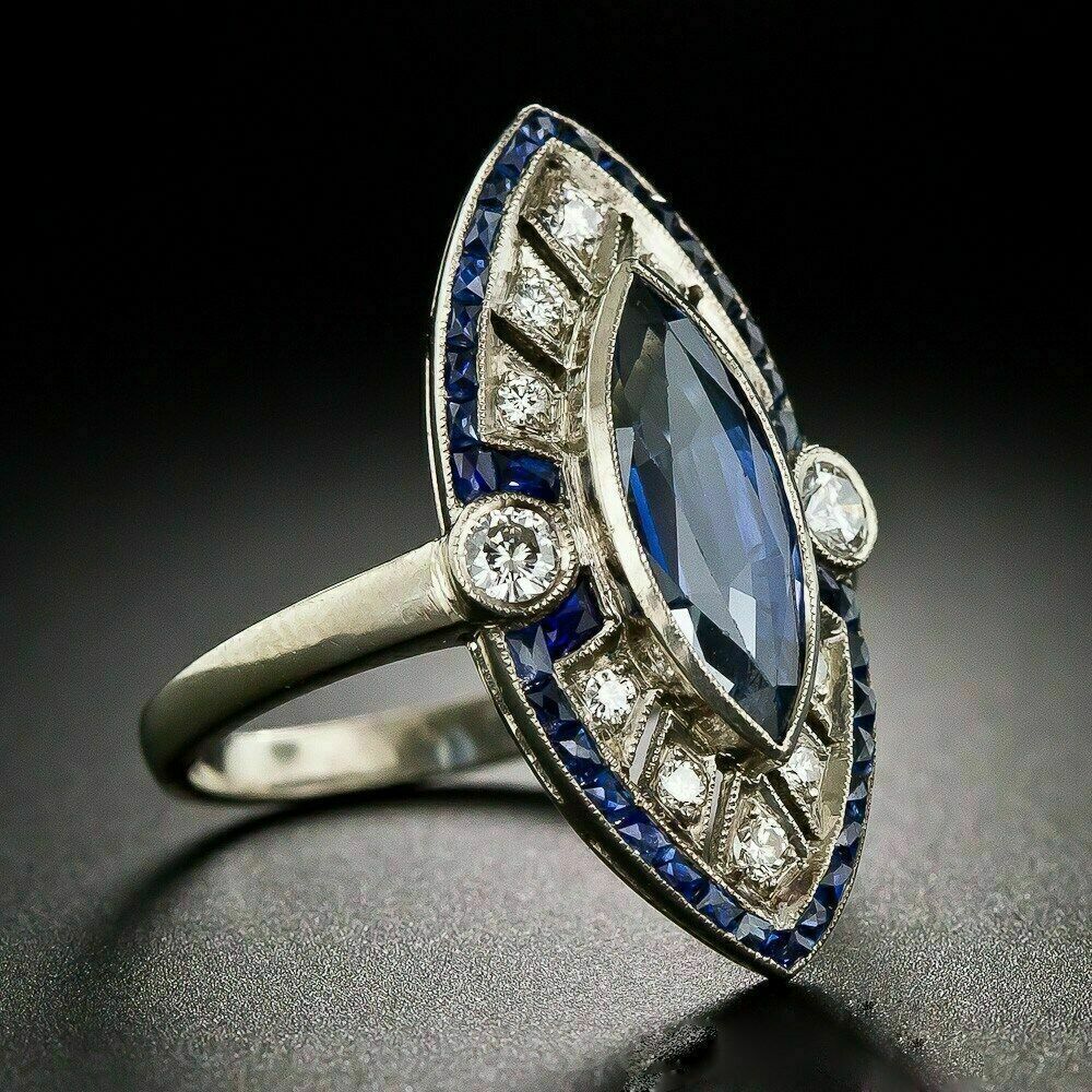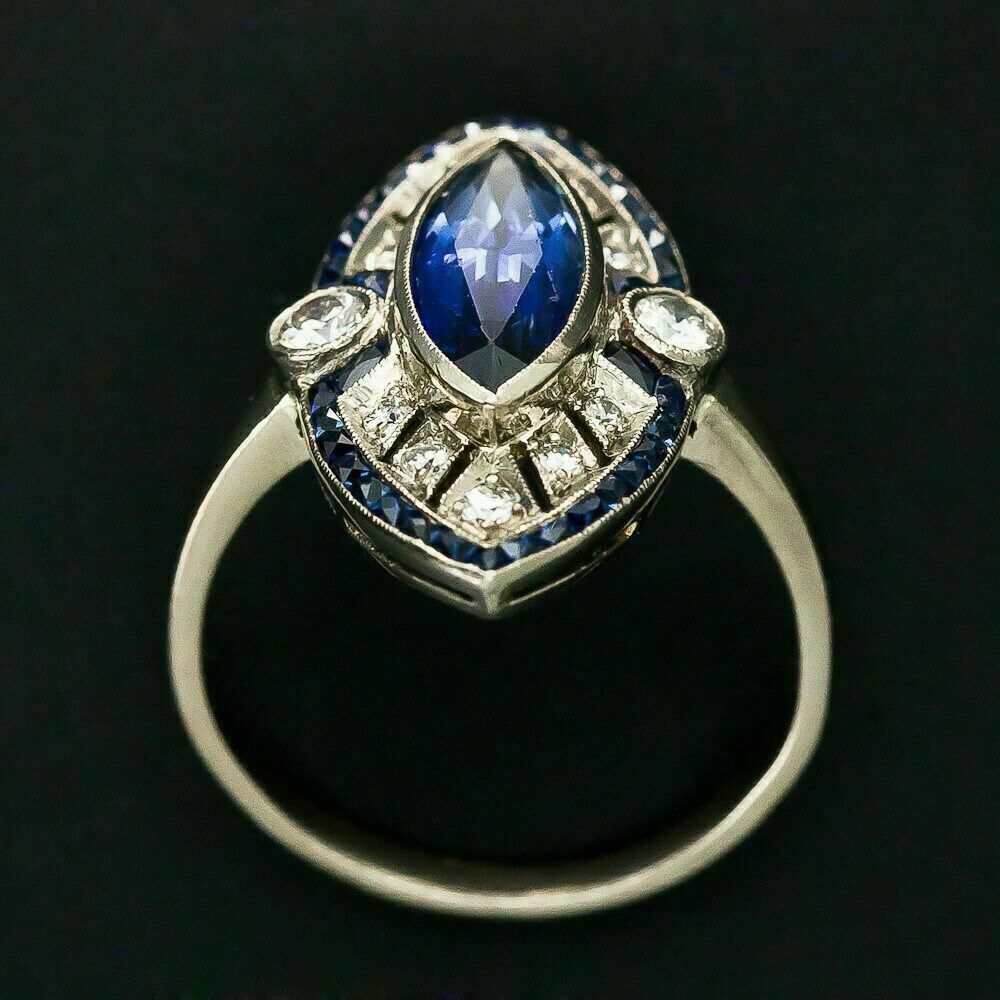 Anello di fidanzamento Art Déco con zaffiro blu taglio marquise da 2 ct con...