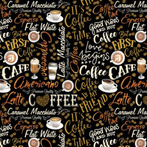 23" X 44" Panel Coffee Roasts Names Types Arabica Kenyan Coffeehouse Barista Cafe Brew Tan Burlap-Look Cotton Fabric Panel (19850-11)