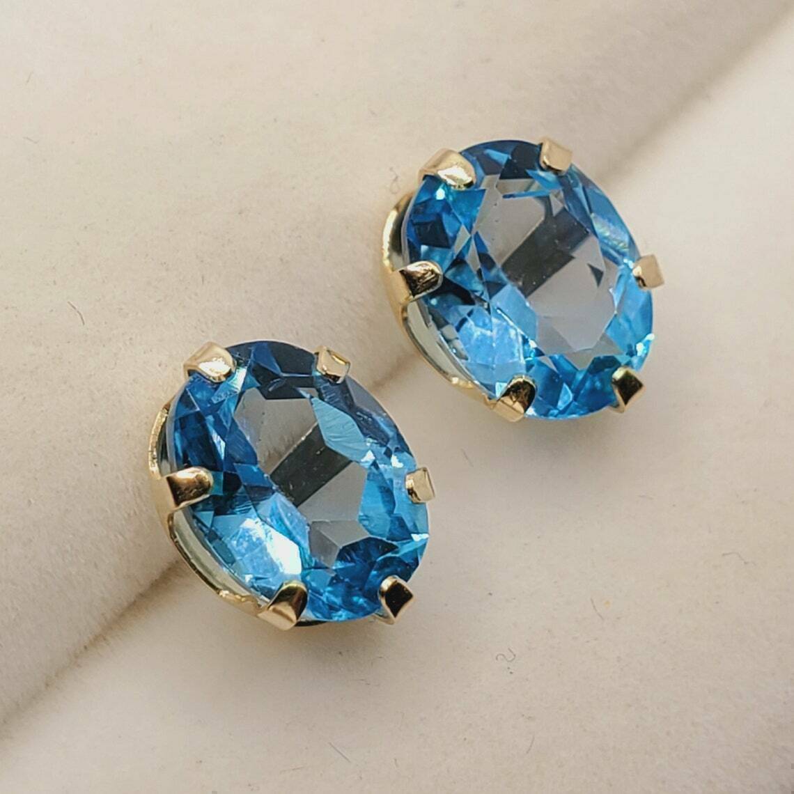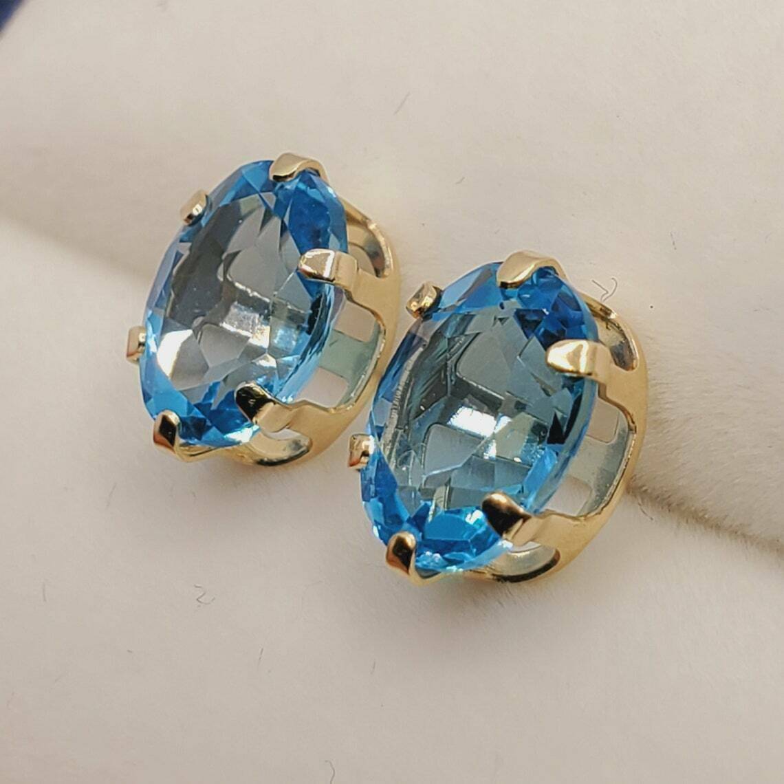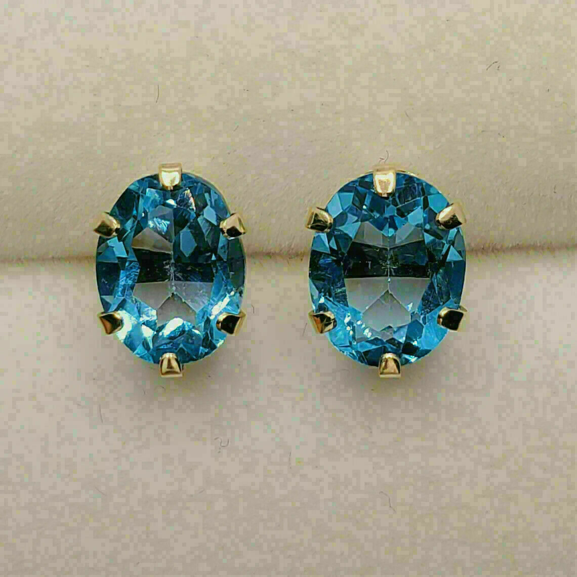Boucles d'Oreilles Femme Solitaire Topaze Bleue Ovale 3Ct Finition Or Jaune 14k