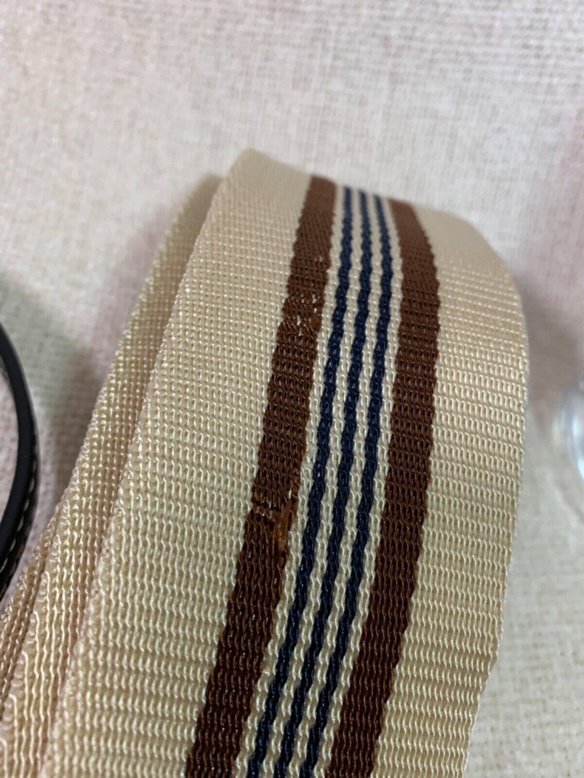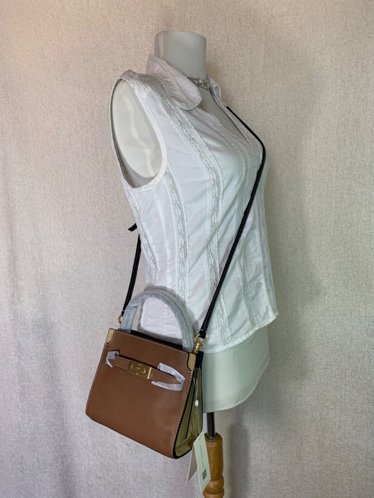 Adjustable, removable crossbody strap with 56.50". webbed shoulder strap is 38" (minor imperfection on the shoulder strap as shown in pic)