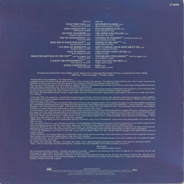 A1 Weep They Will 3:16A2 Love Locked Out 2:40A3 Anytime Anywhere 2:45A4 You're Sensational 3:52A5 How Are Ya Fixed For LoveFeaturing [Duet With] ? Keely Smith2:25A6 I've Had My Moments 3:48A7 Half As Lovely 3:02A8 From The Bottom To The TopPerformer [With] ? The Nuggets (2)2:19A9 I Cover The Waterfront 2:56A10 White Christmas 2:33B1 Sentimental Baby 2:35B2 Five Hundred Guys 2:48B3 The Moon Was Yellow 2:58B4 Nothing In CommonFeaturing [Duet With] ? Keely Smith2:30B5 Where Is The One 3:10B6 Don't Change Your Mind About Me 2:43B7 The End Of A Love Affair 4:09B8 Two Hearts Two KissesPerformer [With] ? The Nuggets (2)2:21B9 Wait Till You See Her 3:07B10 Rain 3:20