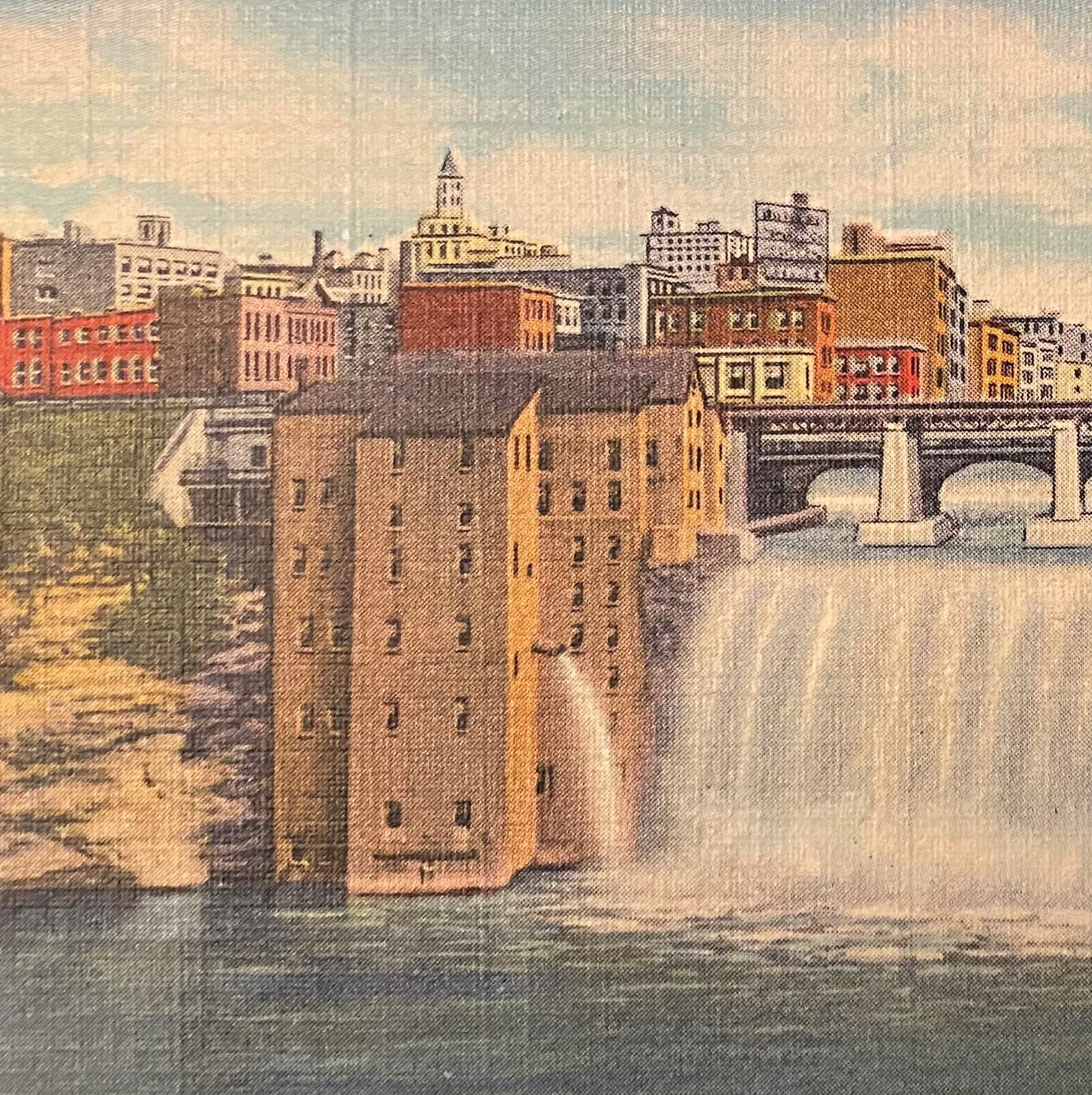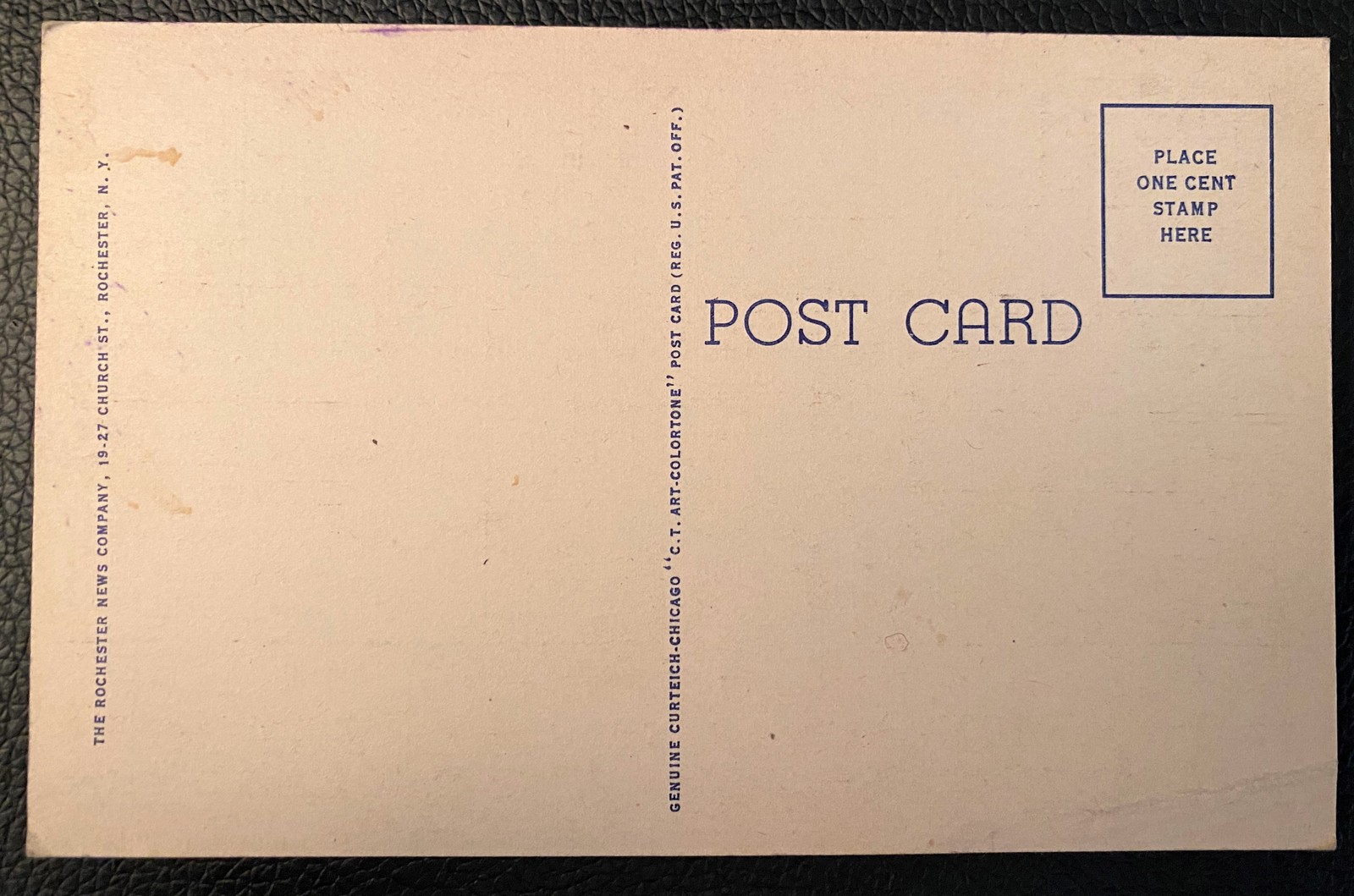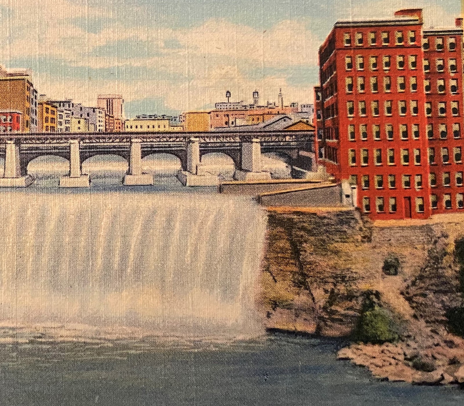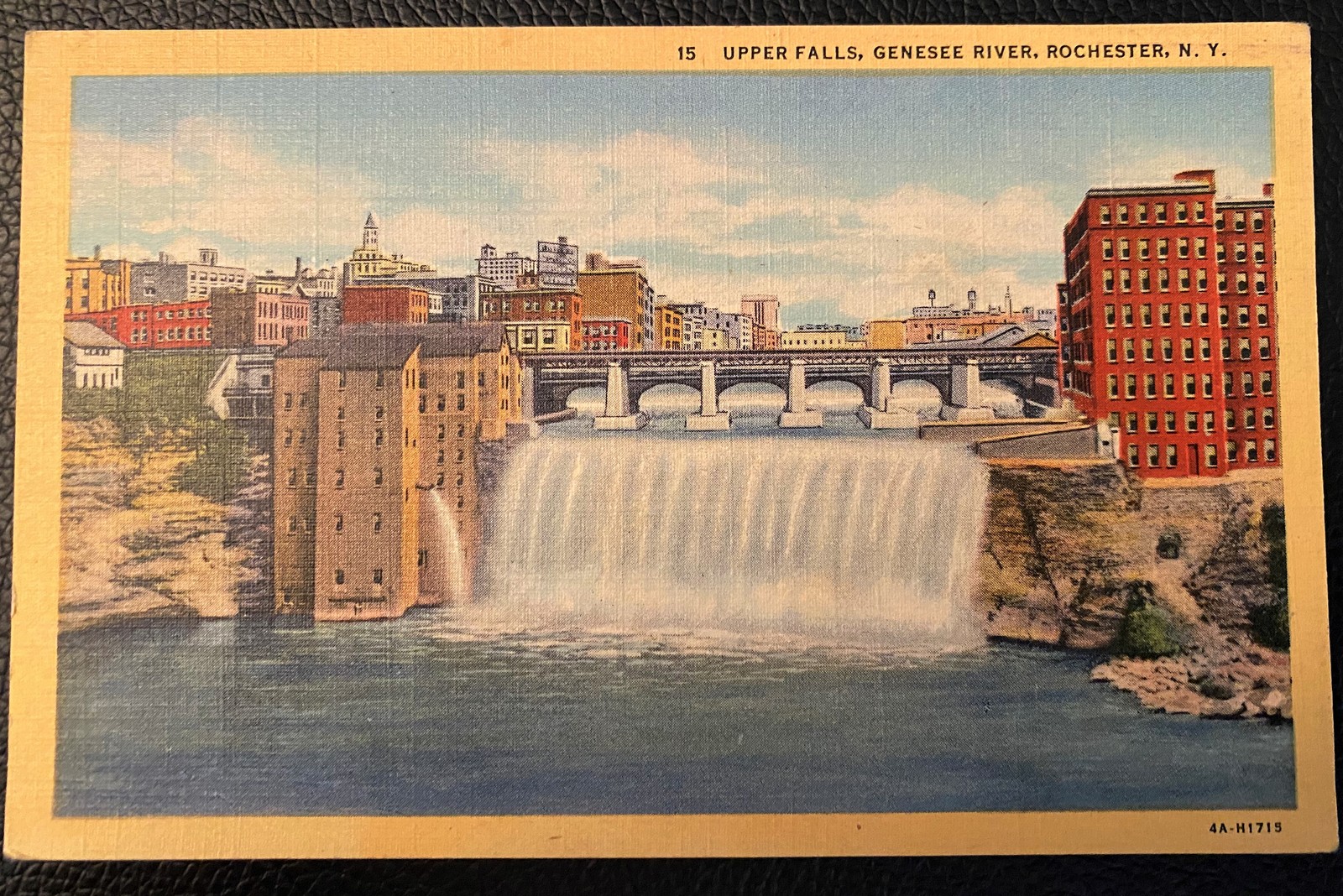 This listing features a beautiful linen postcard with a hand drawn picture lithographed onto the card of the Upper Falls, Genesee River, Rochester, N.Y. This postcard comes from the 1920's.