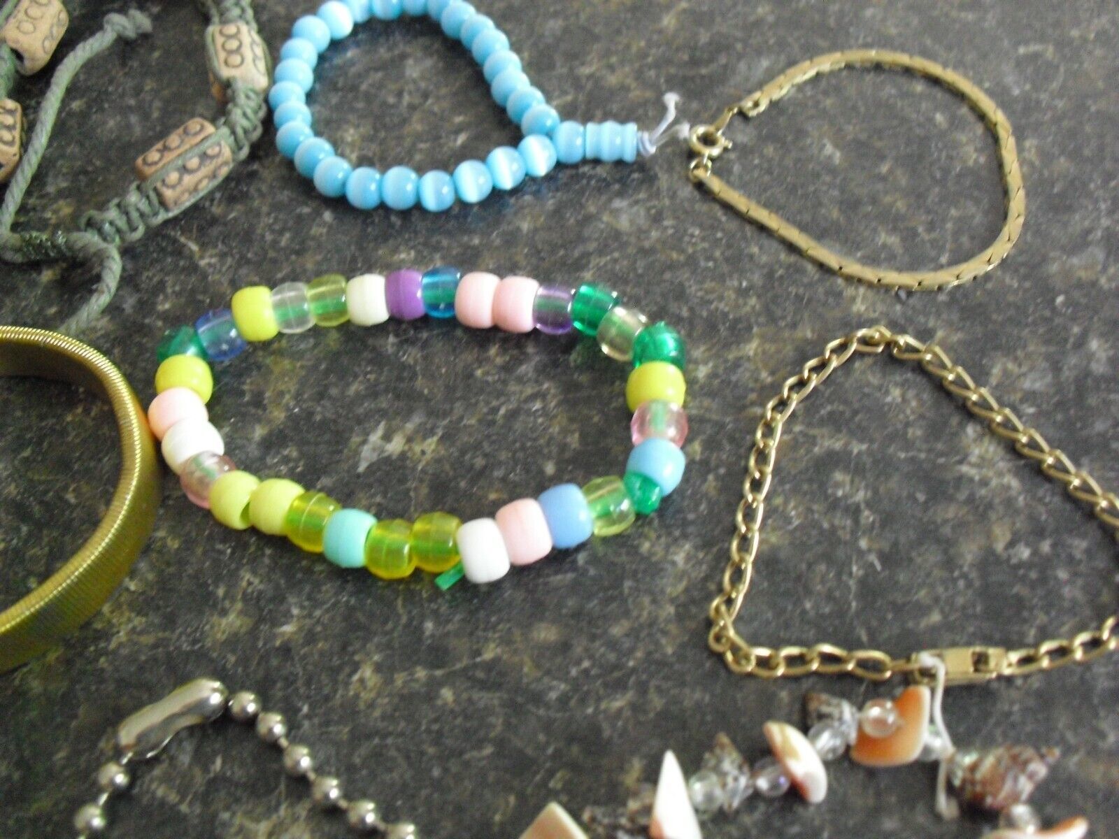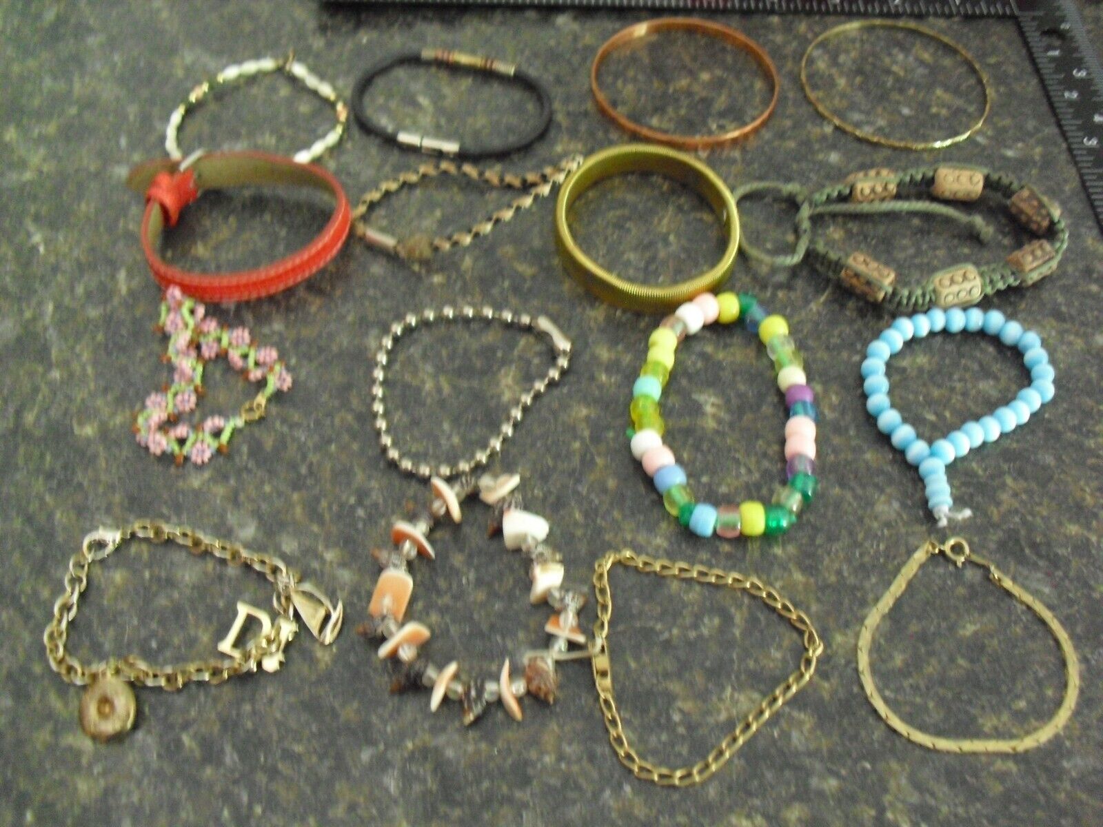 You are bidding on a cool, lot of 16 vintage silver or gold tone metal, a few look like plastic beads or faux stones, assorted bracelets with bangle bracelets, in the picture. Nice shape, very little use to most, a few may have a little more use, some could probably use some fine cleaning. Zoom in for contents.