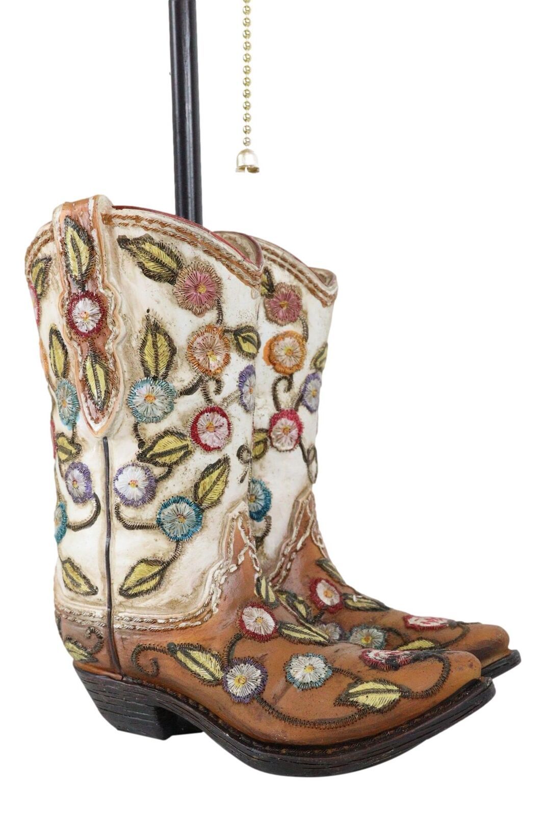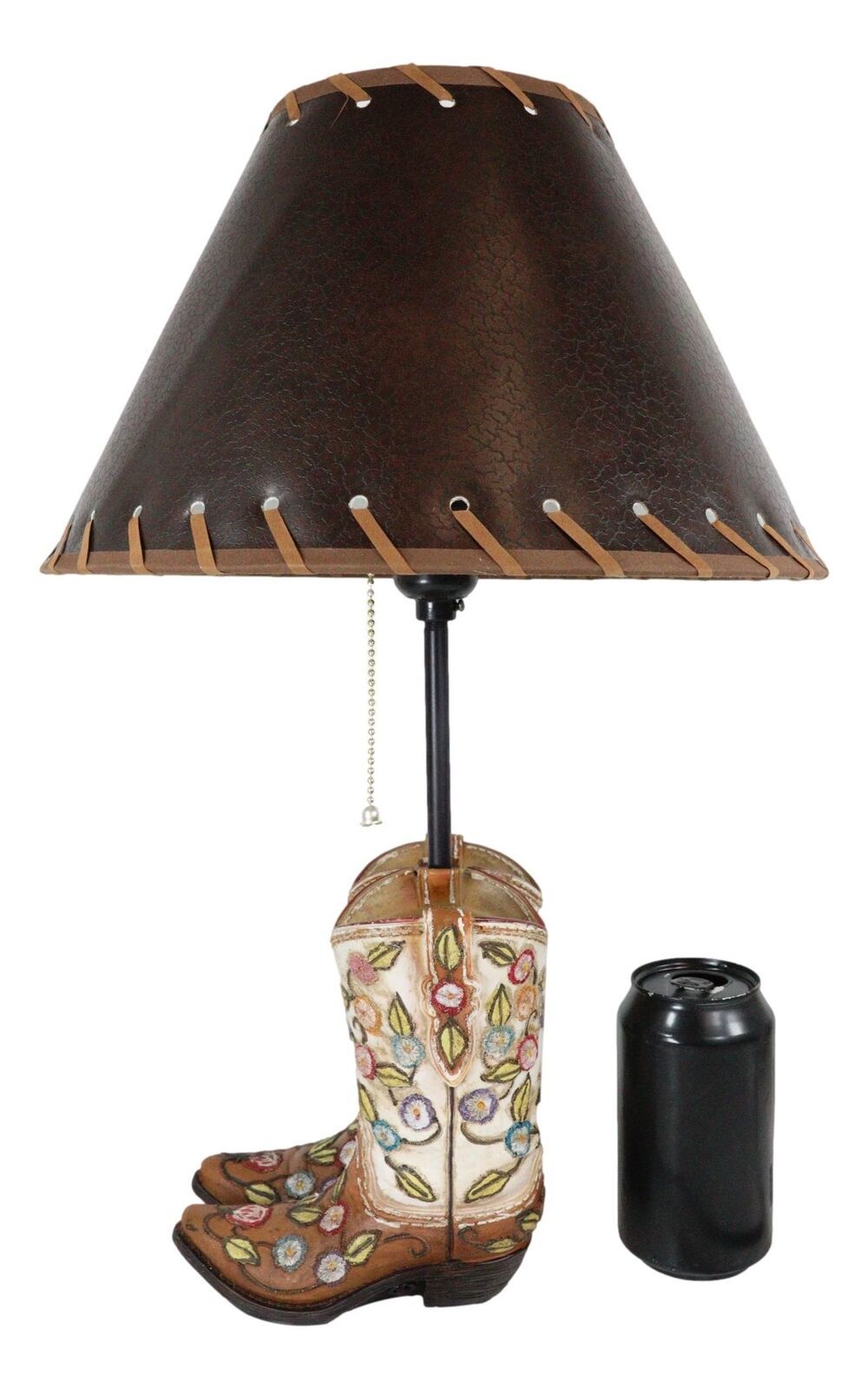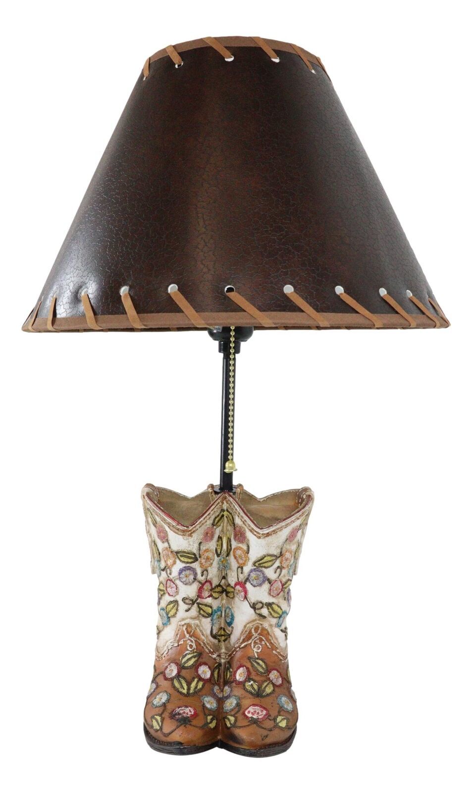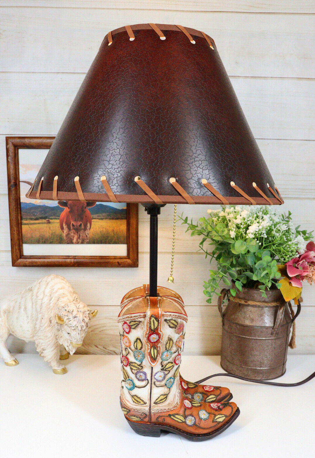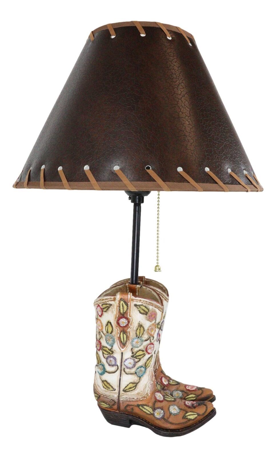 ? This western decoration is always a sensation for the cowboy/cowgirl and lovers of the wild west. This decorative desktop or table lamp adds a well lit frontier touch to any room decorated with Western, Southwest Cowboy/Cowgirl themed home accents. The lamp comes with a leather-like shade with laced borders. The boots sculpture itself is designed with unique floral vines embroidery.