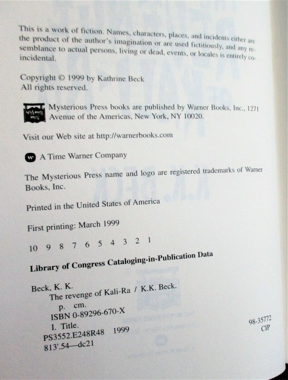 THE REVENGE OF KALI-RA (1999) K.K. Beck - Mysterious Press HC 1st Edition