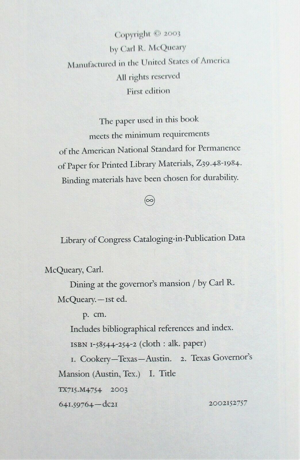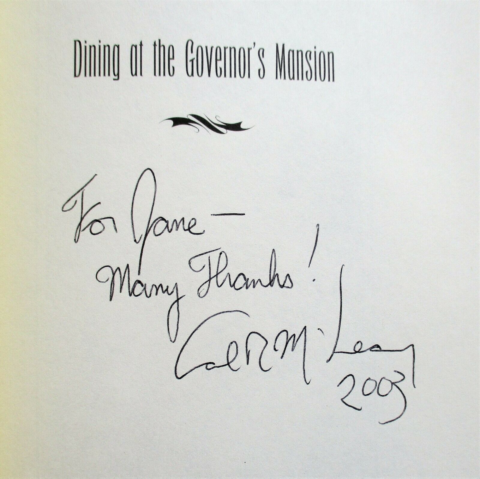DINING AT THE GOVERNOR'S MANSION (2003) Carl McQueary SIGNED - Texas Cookbook