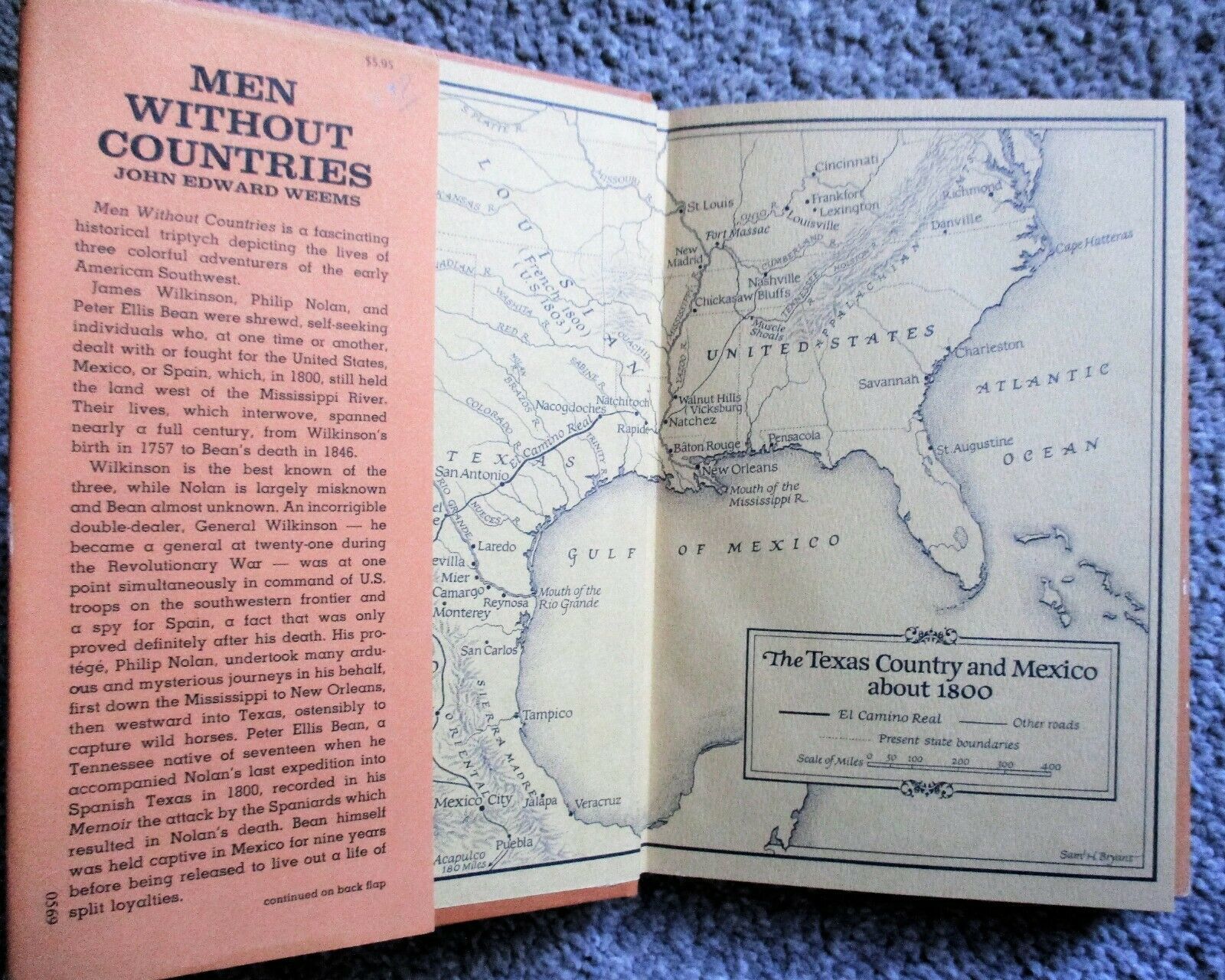 6" x 8.5", 272 page hardcover with dustjacket titled MEN WITHOUT COUNTRIES: THREE ADVENTURERS OF THE EARLY SOUTHWEST by John Edward Weems/ Houghton Mifflin Company, First Printing , Copyright 1969 / A fascinating historical account of three adventurous men of the early Southwest - James Wilkinson, Philip Nolan, and Peter Ellis Bean. John Edward Weems takes the reader on a trip to the Spanish occupied lands west of the Mississippi through the fascinating lives of three men, two of whom (Philip Nolan and Peter Ellis Bean) are not well known in the history of our country and deservedly so. The other, Gen James Wilkinson, is famous for his role in the Revolutionary War and the later revelation of his role as an agent of Spanish government. In the early 19th century, the American west was a great lure to the imaginations of all the many men whose lives were stifled by the established east and without them, this country may still be a minor power. Although these three did not change our history, their stories bring us back to a time when men by their actions were able to forge their own destiny.