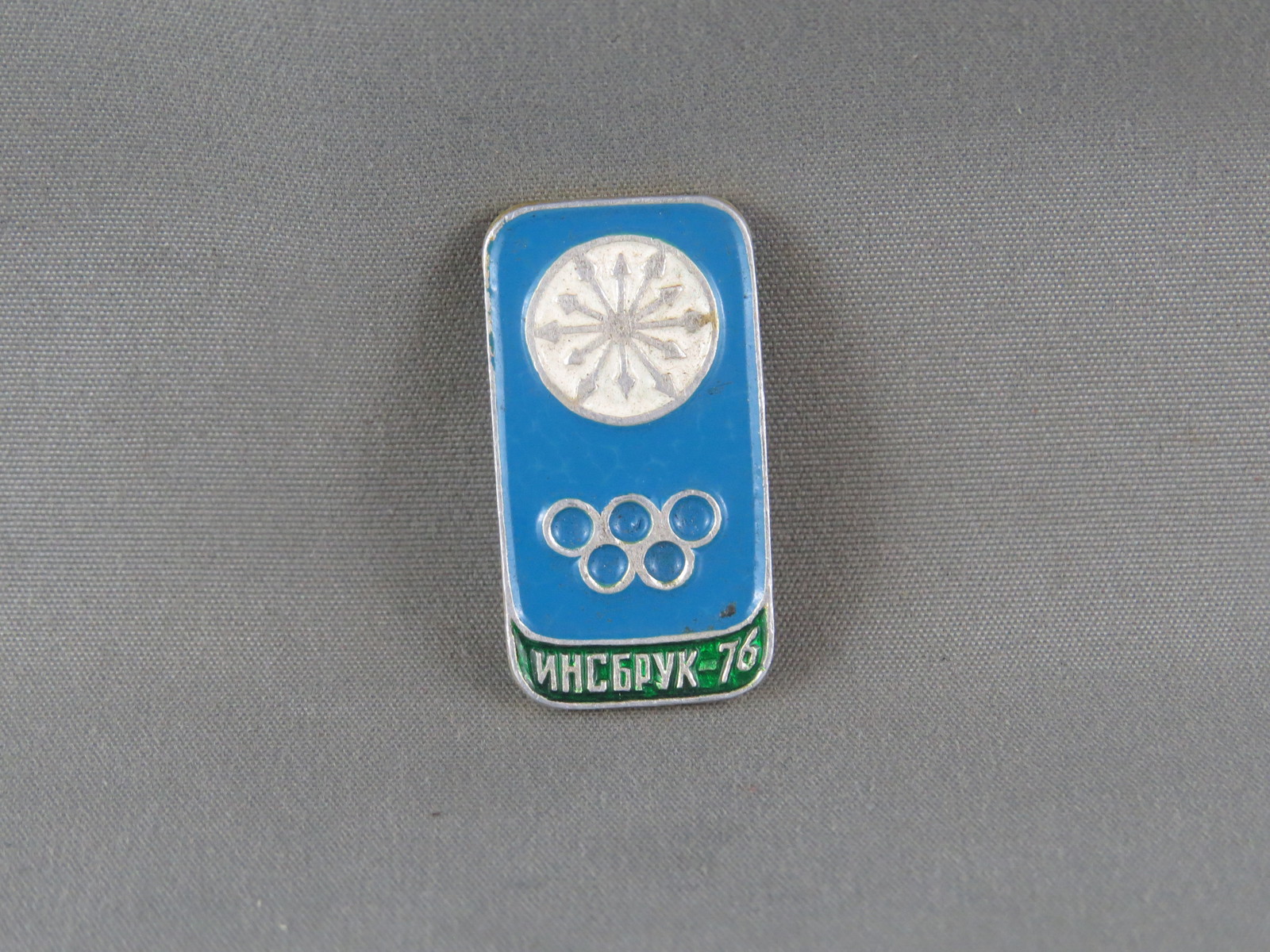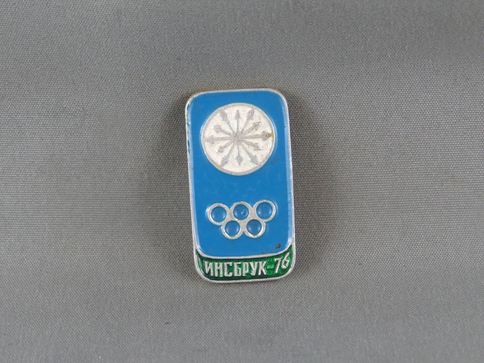 Up for sale is an Innsbruck 1976 pin. It has a blue base colour. The upper portion of the pin has the event logo stamped in with the Olympic rings in silver underneath. The bottom of the pin has Innsbruck 76 stamped in Russian. What a great addition to any pin colleciton.