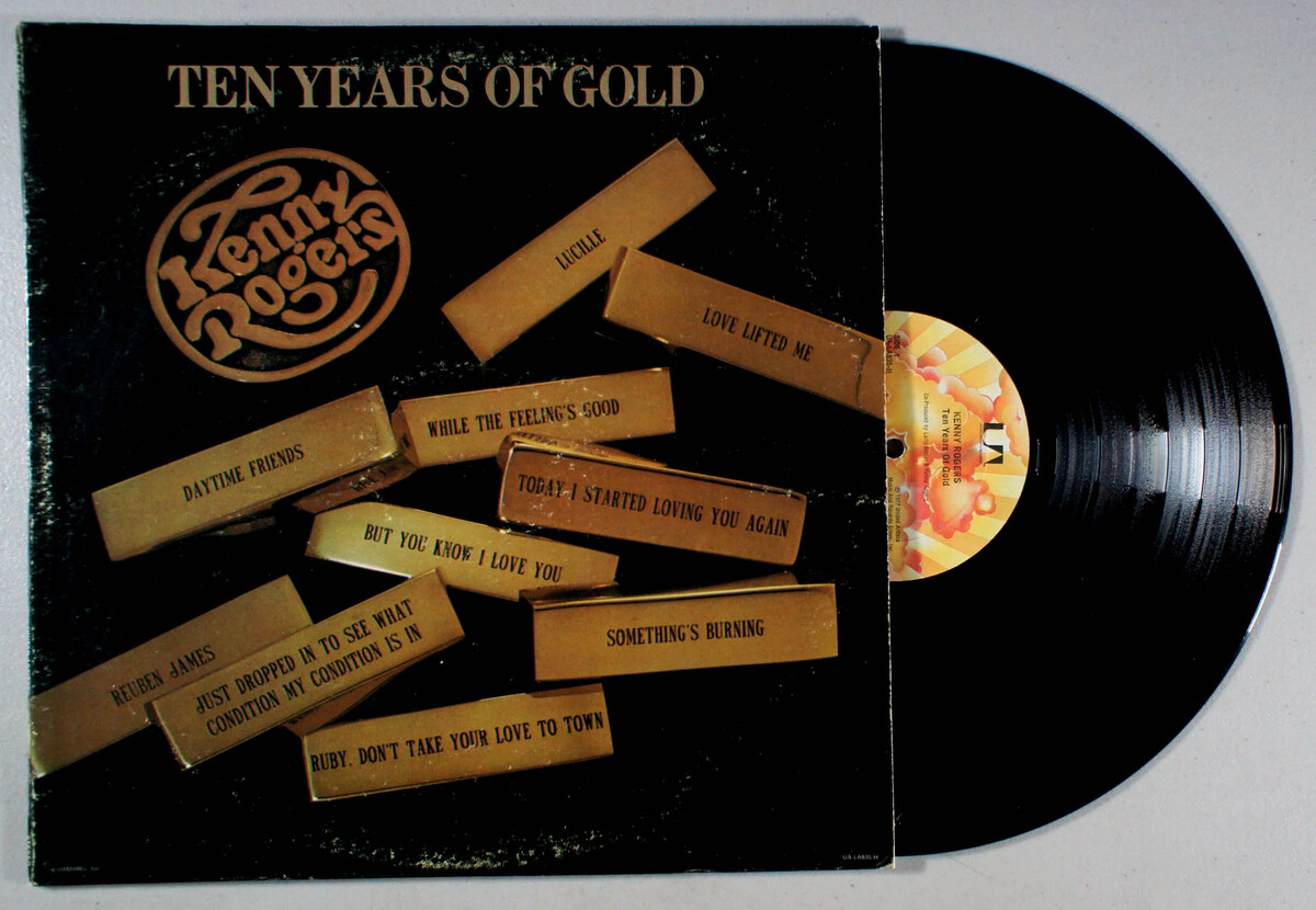 Ten Years of Gold, by Kenny Rogers, is a collection of ten songs spanning a decade. The album features solo re-recordings of hits Kenny had with The First Edition. These new versions were recorded at Jack Clement Recording Studio "B" using Kenny Rogers' road band "Bloodline". Side 1 of the LP contained the all re-recordings. Though Kenny had already scored three other solo hits, Lucille, Daytime Friends, While The Feeling's Good and Love Lifted Me are all that represent his recent work. The last track is the First Edition's original hit recording of Today I Started Loving You Again, which was featured on the First Edition's 1972 album Back Roads; Kenny still had the rights on this song, therefore this version is present. Oddly the First Edition are not credited on the album jacket, even individually.