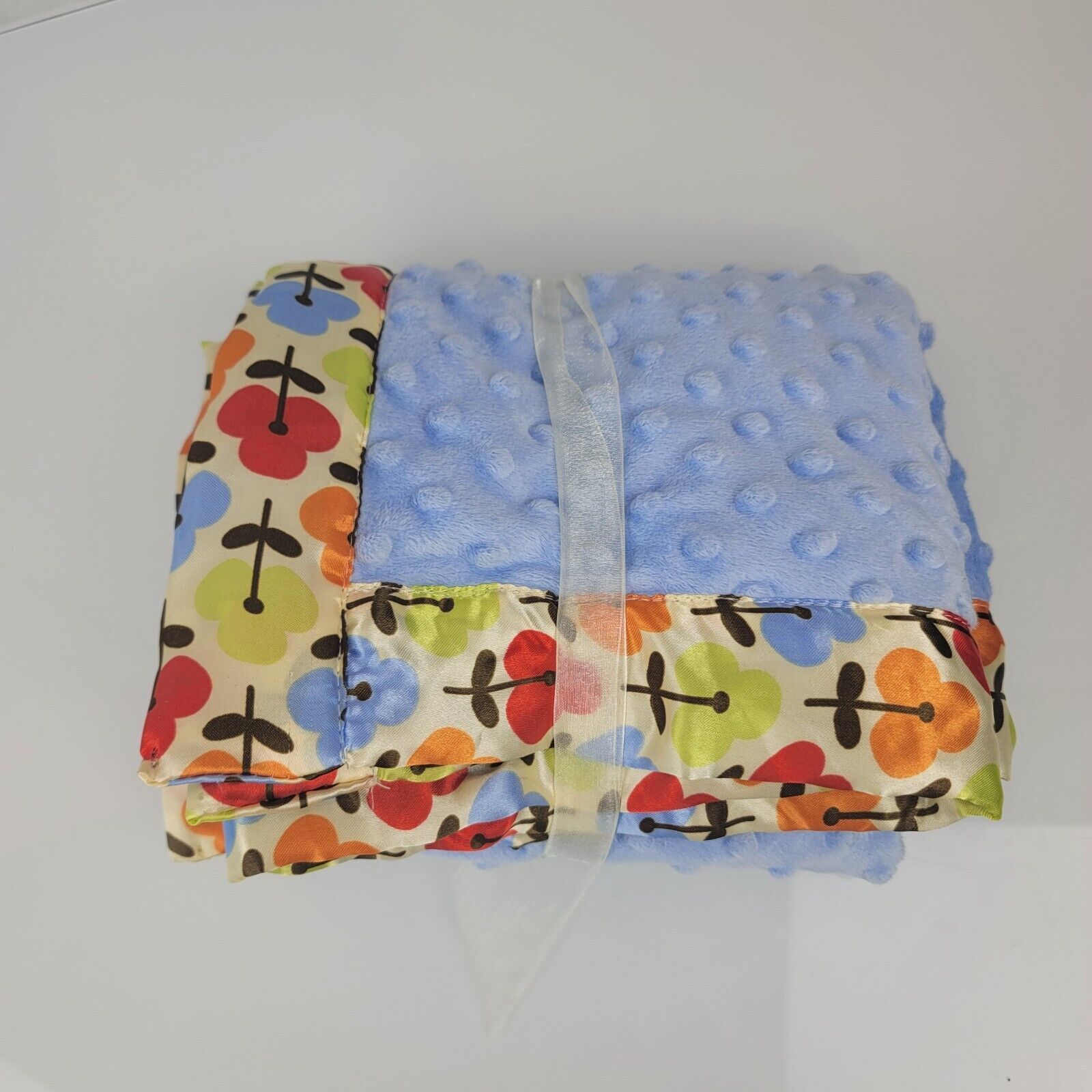 Little Beginnings Blue Minky Dot Baby Blanket Red Orange Green Flower Satin Trim