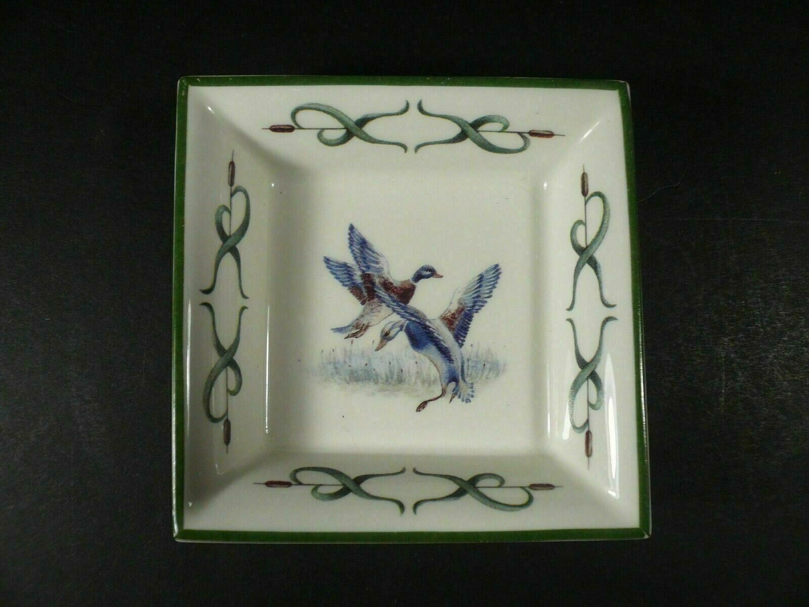 Small Italian Trinket Dish Ducks Birds Green Trim Cattails 3" x 3"