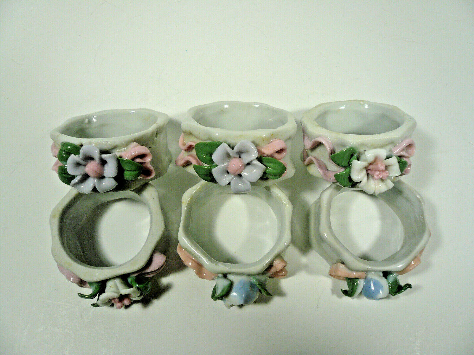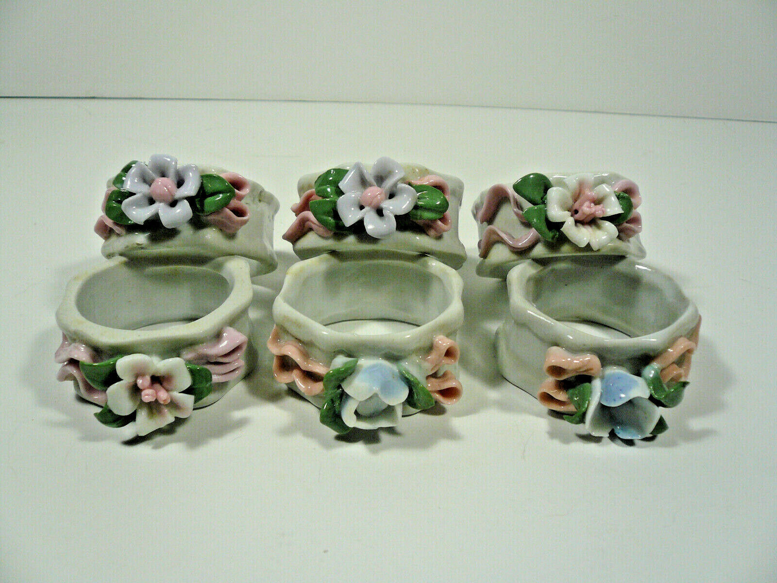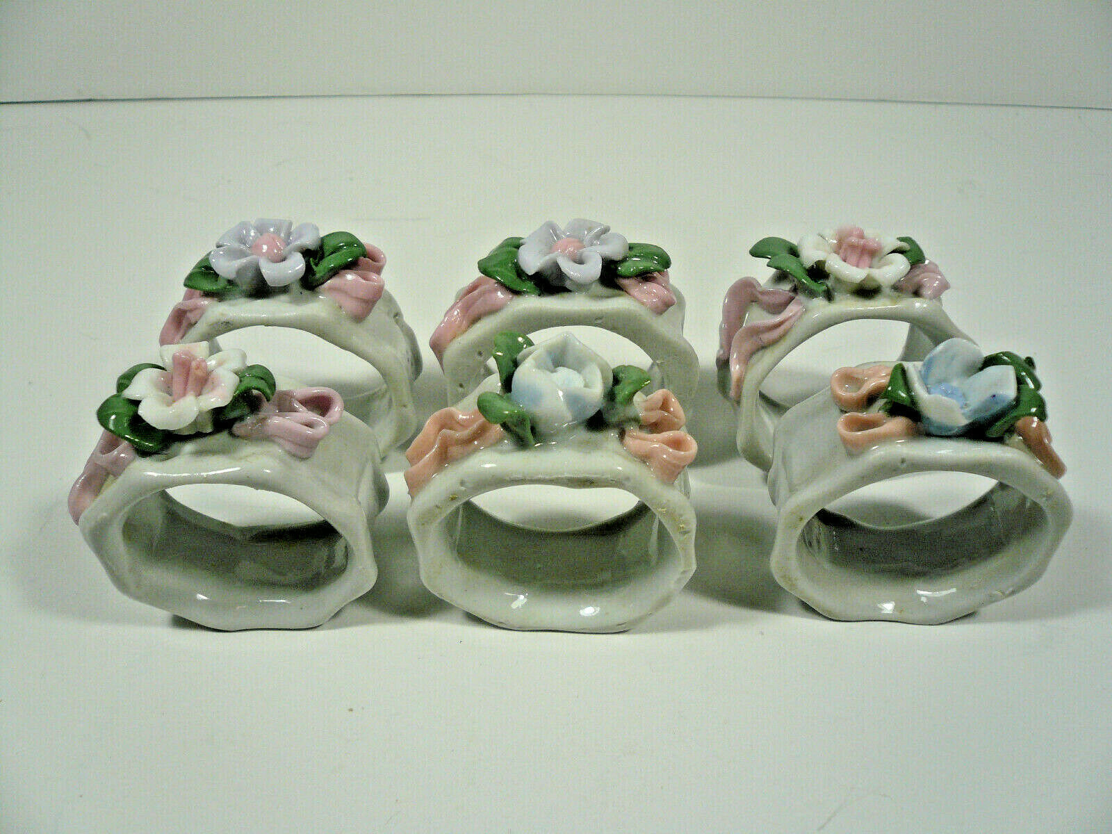 Vintage Porcelain Napkin Ring Holders Flowers Ribbons Bouquet Set of 6