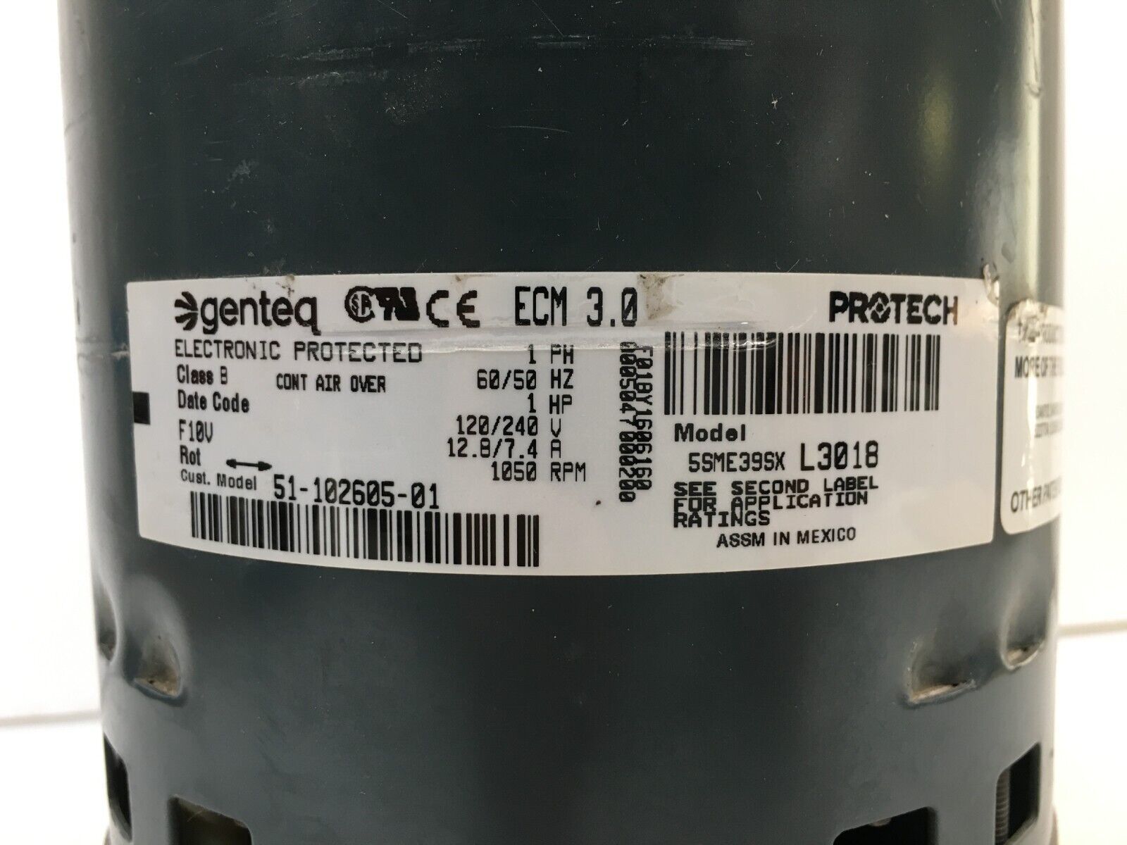This is GENTEQ ECM 3.0 MOTOR 1 HP 1050 RPM 5SME39SXL3018 p/n 51-102605-01 GC07 CCWLE rotation used part.