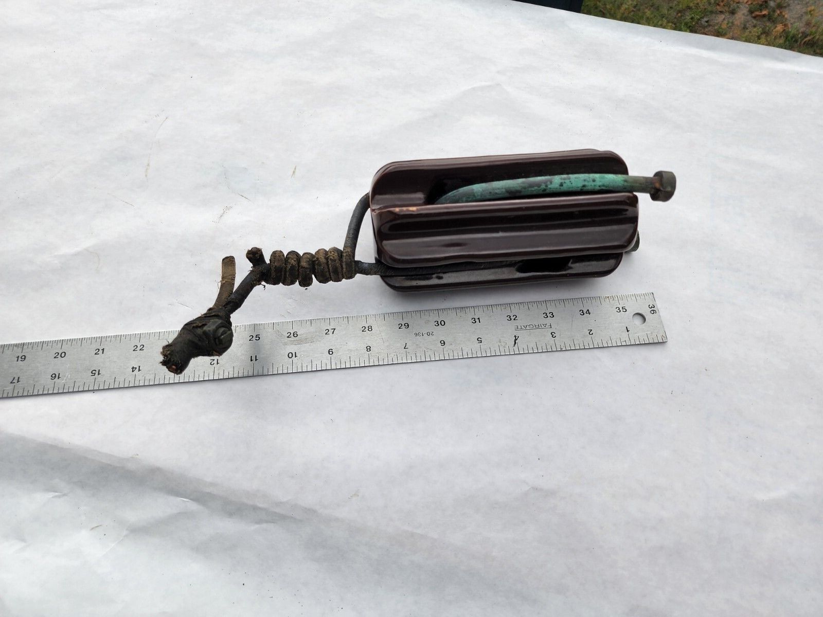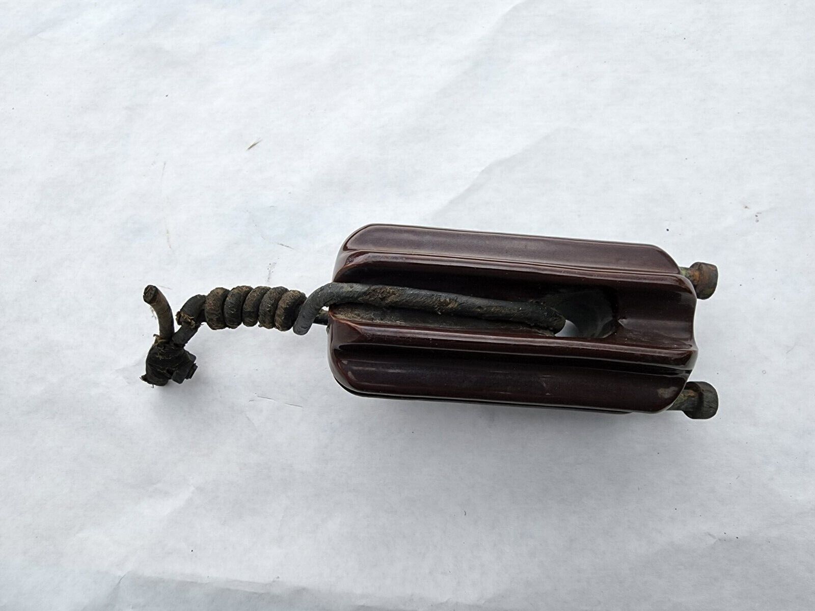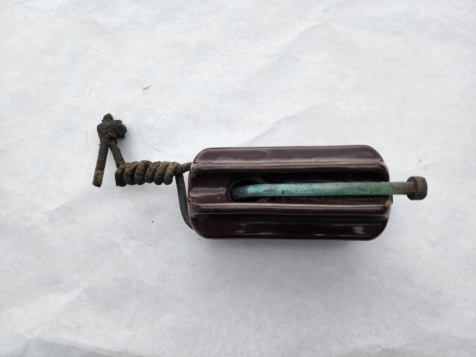 Brown Porcelain Westinghouse strain insulator with some hardware and original tie wire these were sometimes used as dead-ends on line wires or distribution of low voltage to houses in the town where it came from