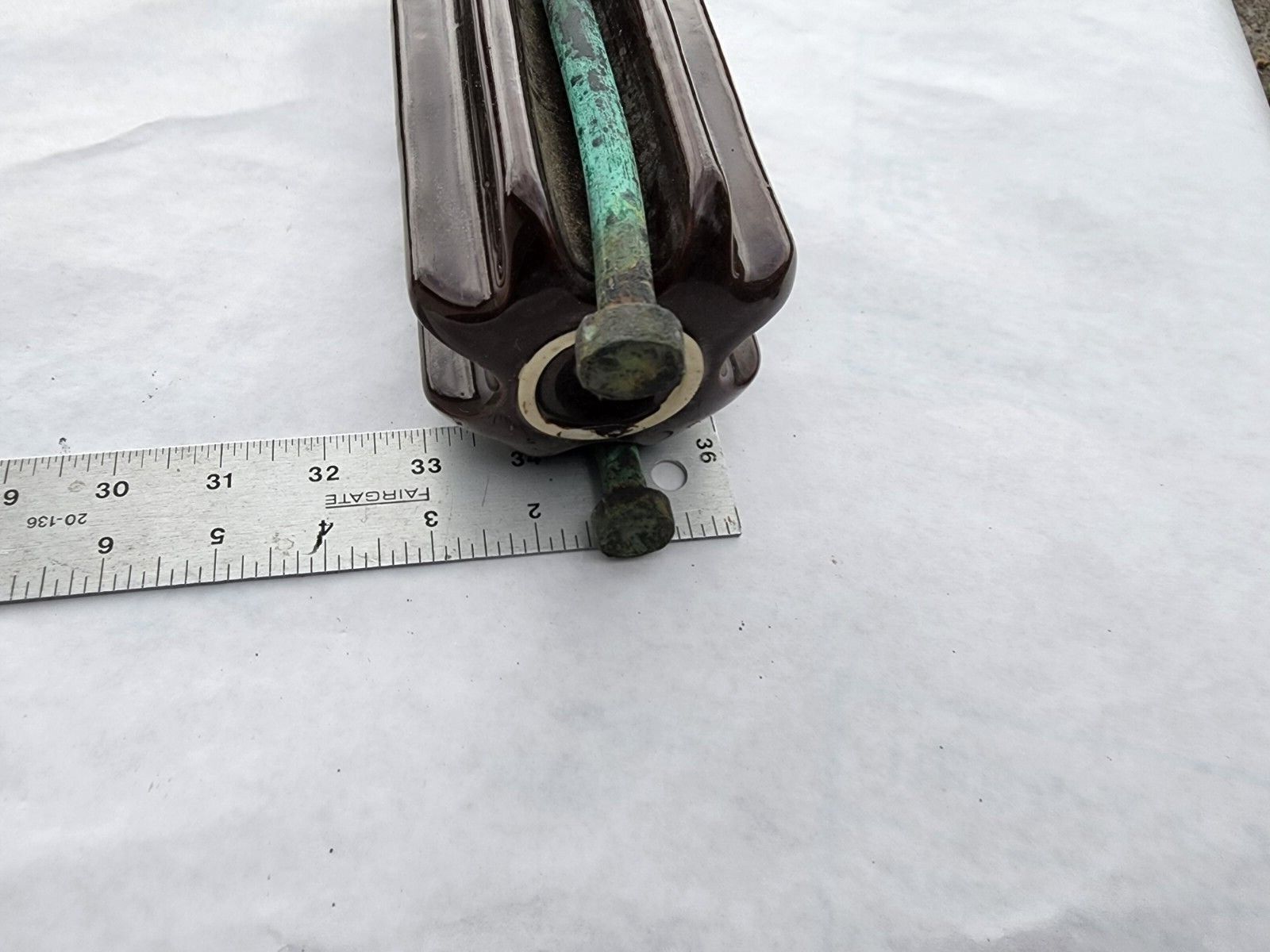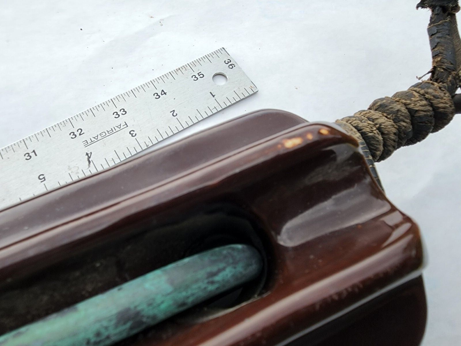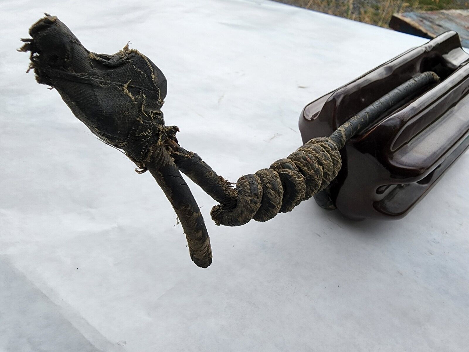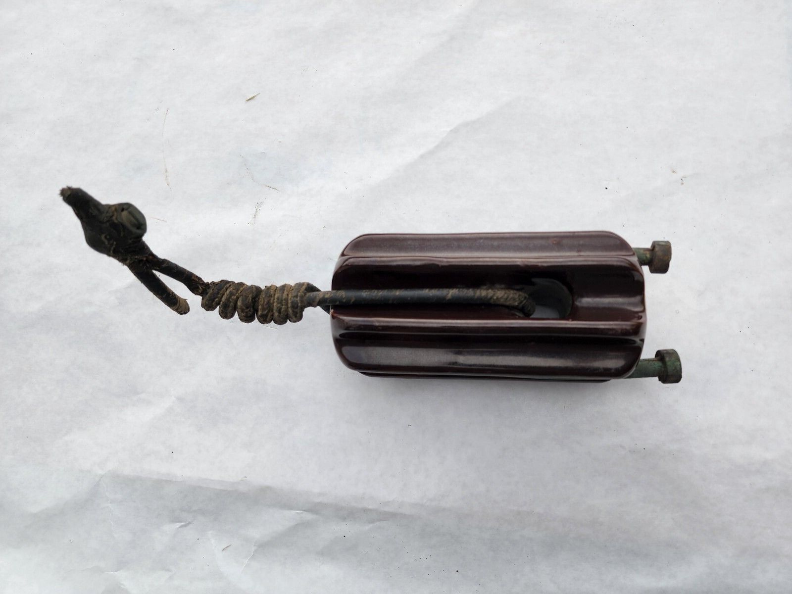 Brown Porcelain Westinghouse strain insulator with some hardware and original tie wire these were sometimes used as dead-ends on line wires or distribution of low voltage to houses in the town where it came from