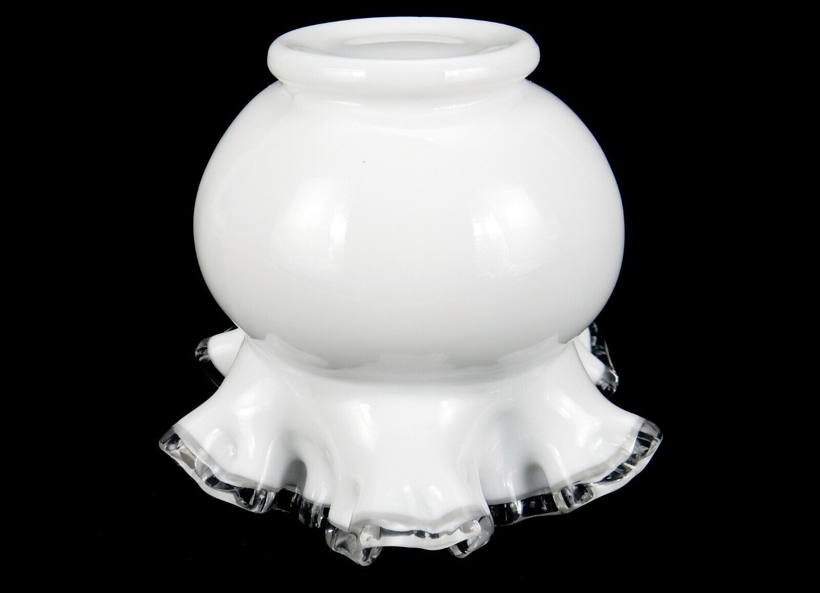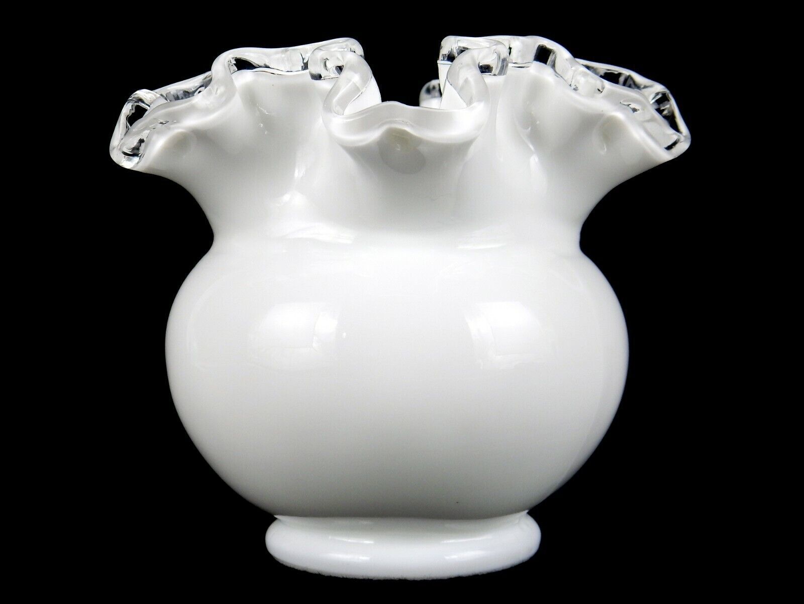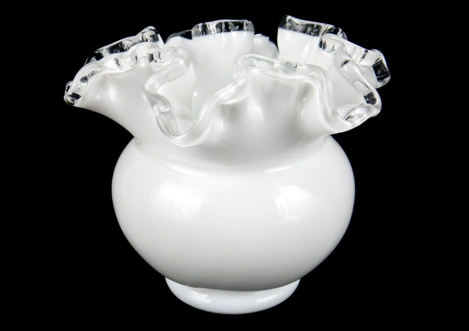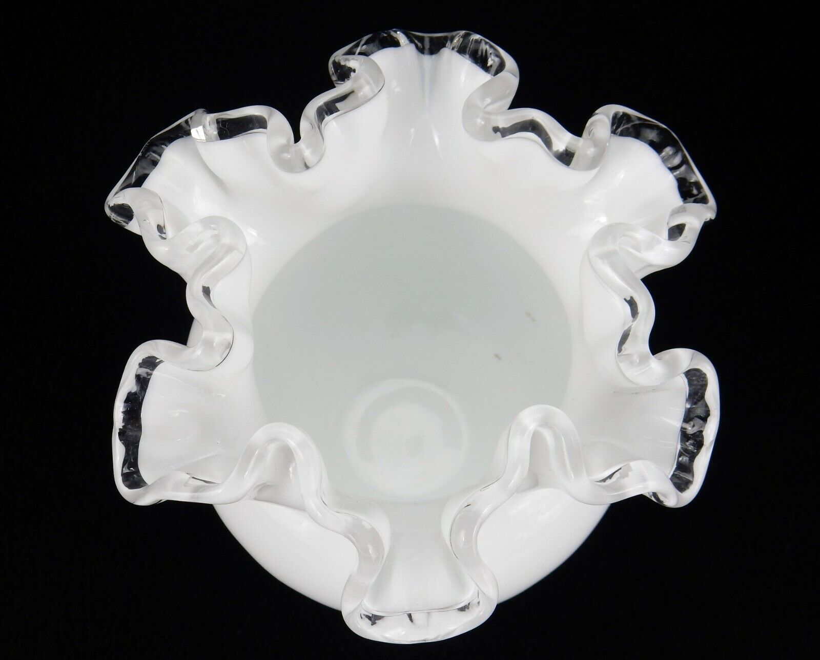 Fenton Silver Crest Vase, 4" Round White Milk Glass w/Ruffled Rim, Short Base