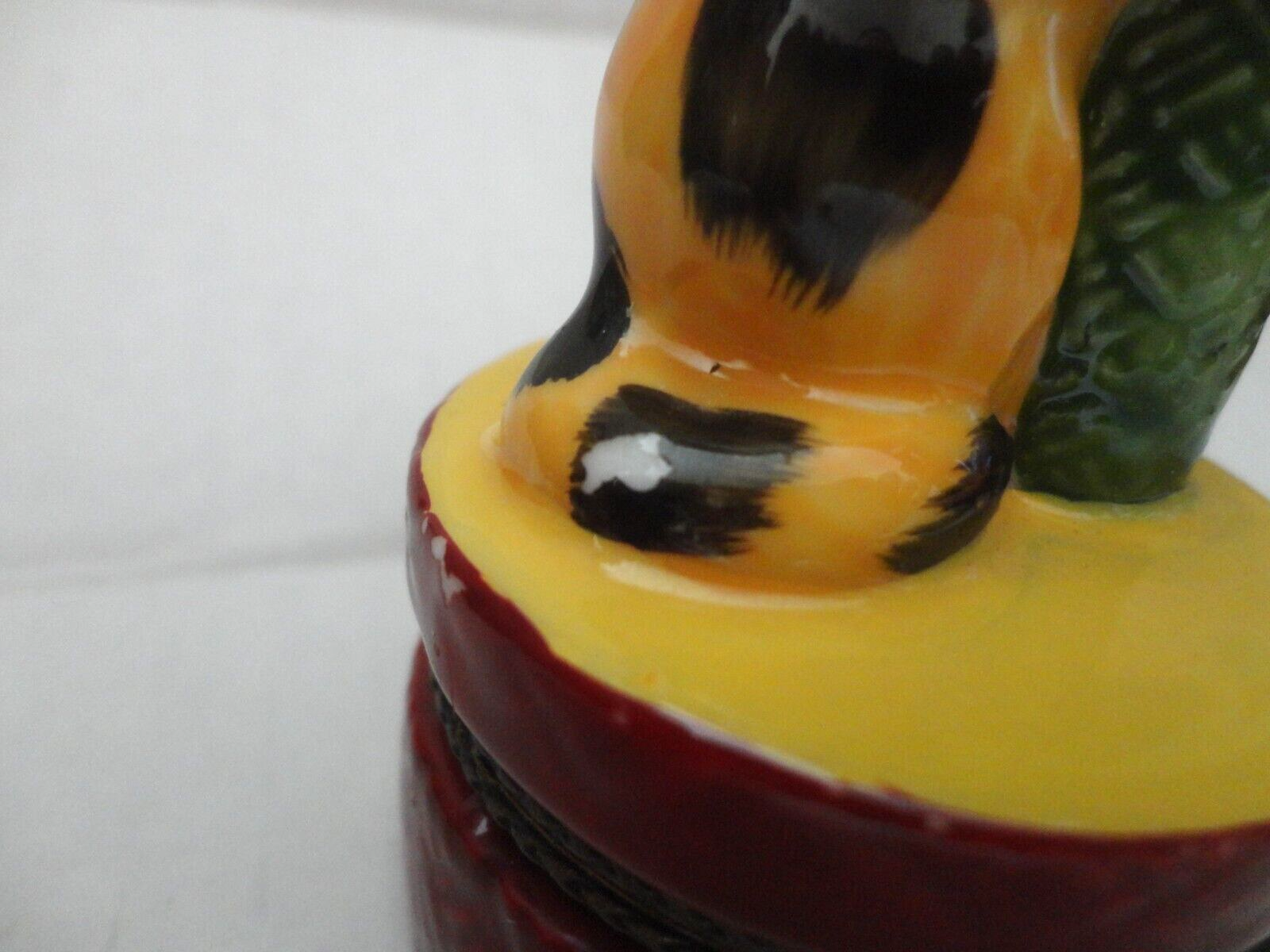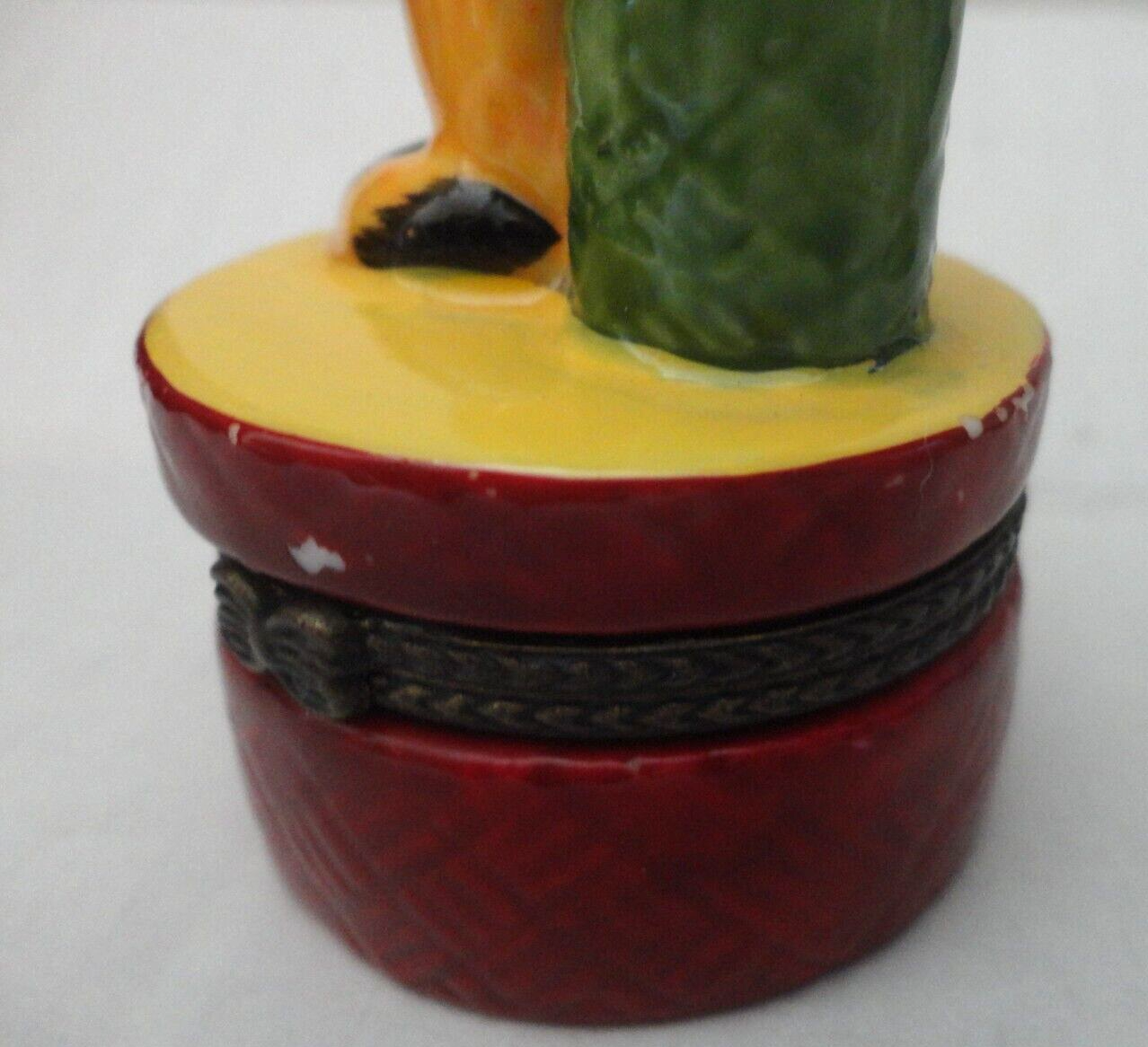Cute trinket box with nice, bright colors. No cracks or chips, some paint wear that I was able to capture in the pictures. Great item.