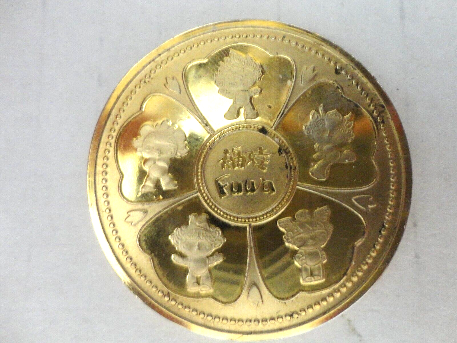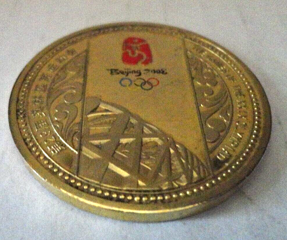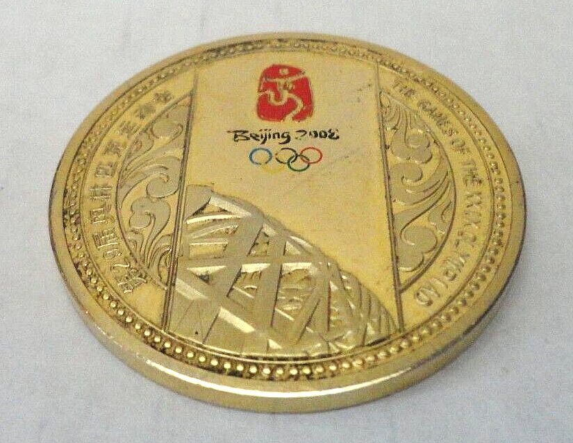 This listing is for a 2008 Commemorative Coin from the Beijing Olympics. It measures approx. 1 1/2" in diameter. There is come wear and loss of coloring that you can see in the pictures. Nice collectible item.