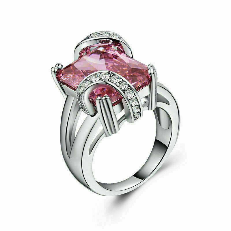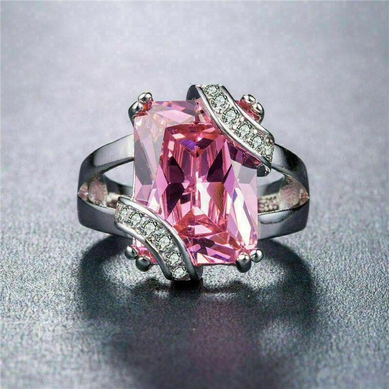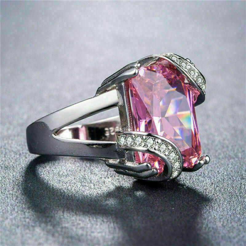 3Ct Taille Emeraude Saphir Rose Femmes Unique Fiancailles Bague 14K Blanc or Sur