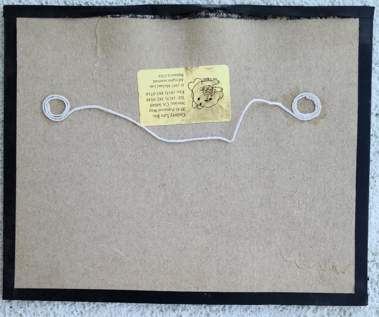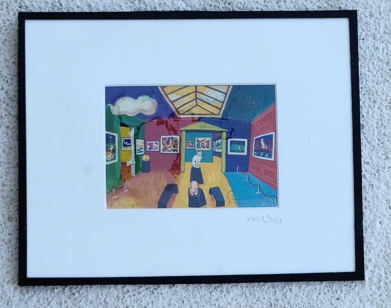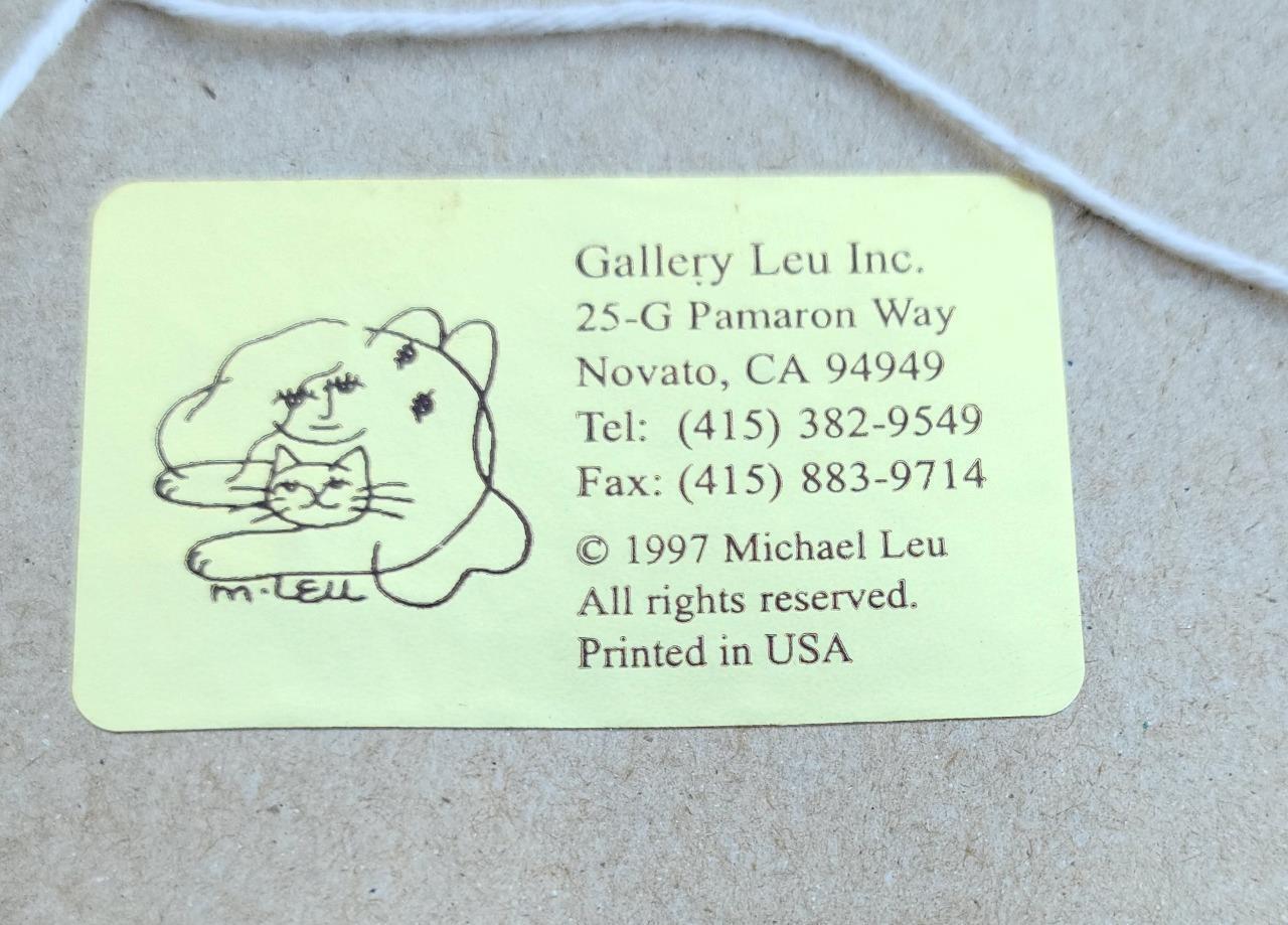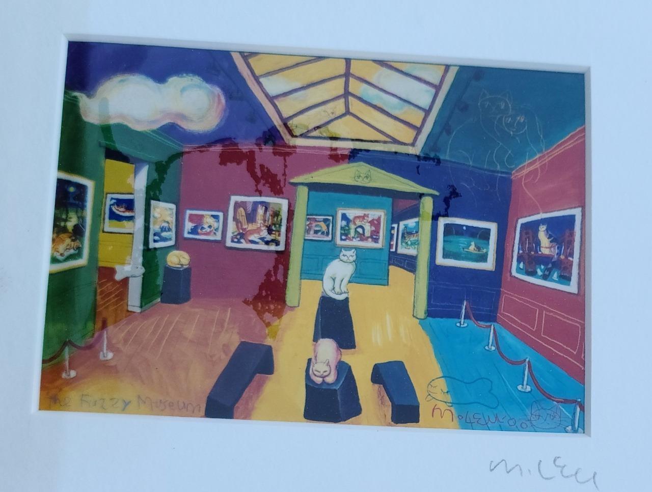 Offered here is this Fabulous Colorful Artwork Print Titled 'The Fuzzy Museum'. The print is contained in a matte and is behind glass, but has not actual frame other than that. There is tape around the edges of the glass that make it look framed. There is some moisture warbling on the back cardboard of the piece. The original art was done by Michael Leu and has a signature in pencil on the matte and a signature facsimile on the art print itself. The sticker on the back of the frame from the gallery is dated 1997. The entire piece is 8" top to bottom and 10" wide. This is a lovely, colorful Michael Leu print that will be a welcome addition to your artwork collection.