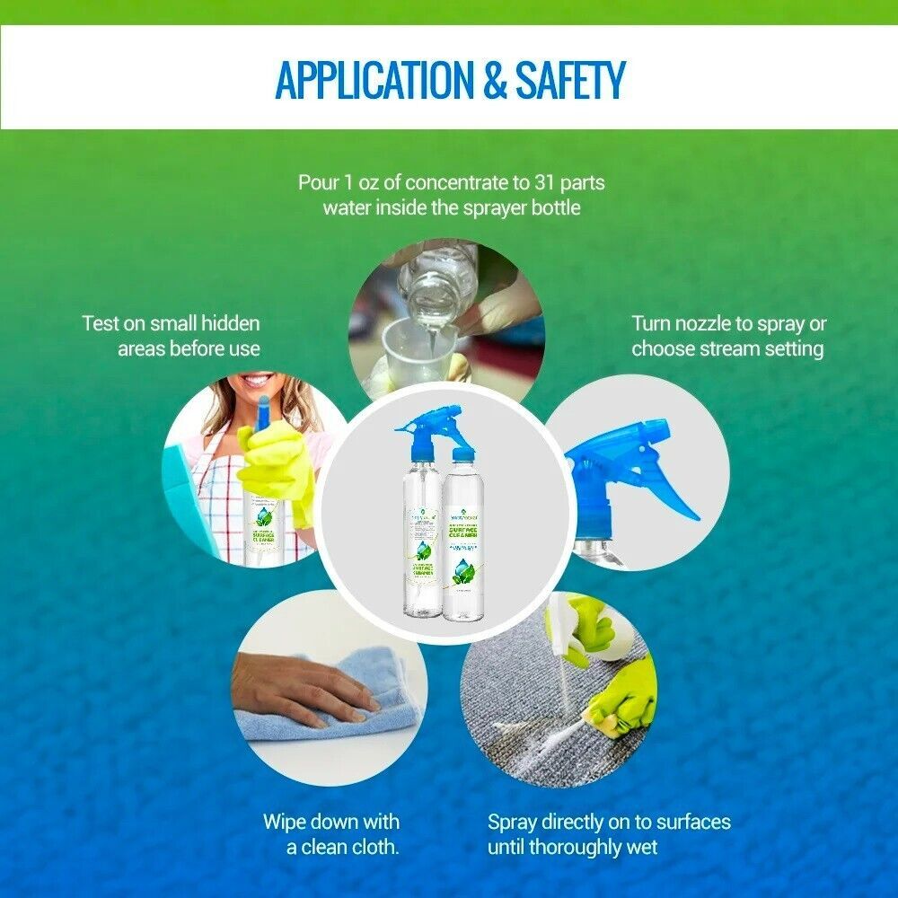 ENOUGH CONCENTRATE to fill 16 BOTTLES OR 512 OZ of cleaning solution UNLIKE COMPETITION which gets over in a couple of days. The SPRAY BOTTLE has the best DUAL functionality of MIST and STREAM based on your cleaning needs. Pour 1 oz of concentrate to 31 parts water inside the sprayer bottle. Sprays directly on to surface and stains until thoroughly wet. Wipe down with a clean cloth and repeat for heavily soiled areas in household.
