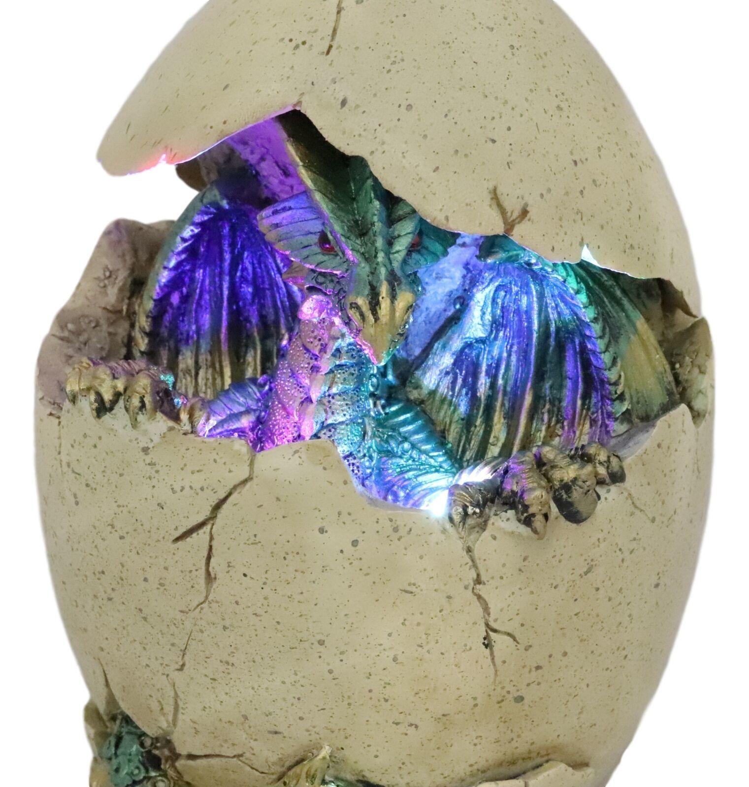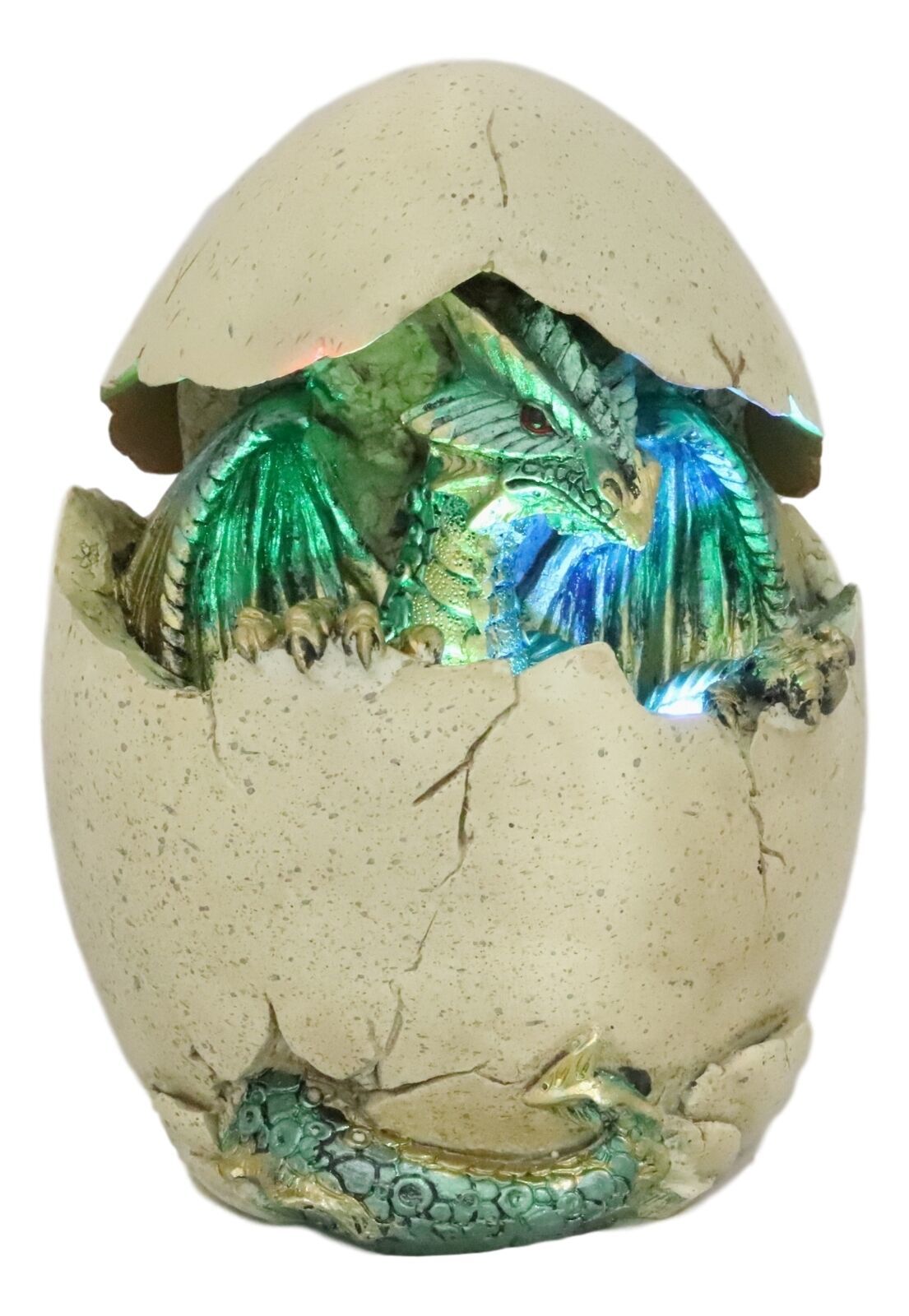 ? A powerful green dragon emerges from its egg into the world. Our artisans pay great attention to the sculpting of the egg and the dragon inside. You can see the dragon breaking off the top part of the egg, peeking sheepishly out of the egg still within the comfort of the egg shells. We added an extra cool feature to the sculpture with color changing LED lights, creating a pretty night ambiance of fantasy in your room.