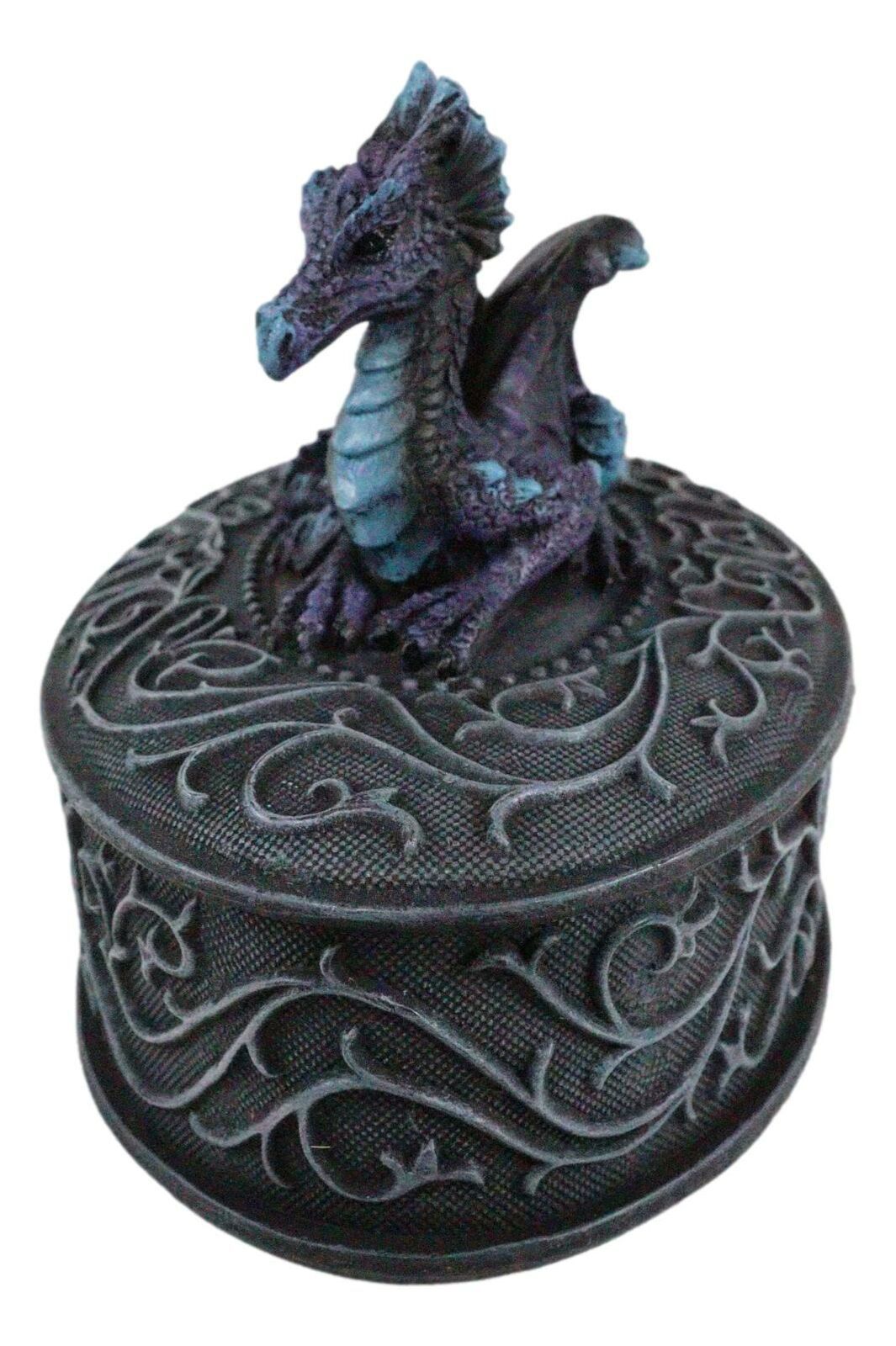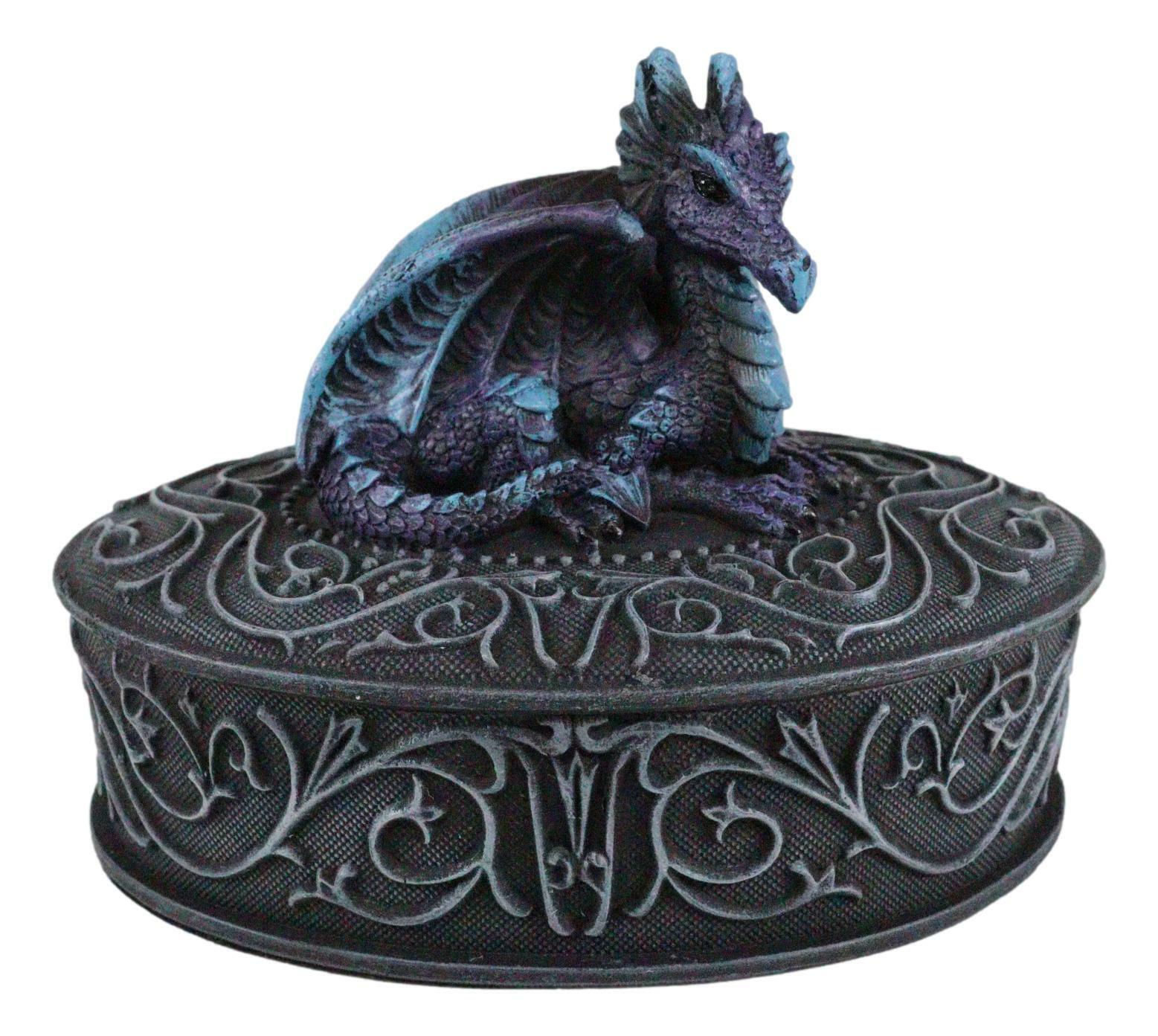 ? Perfect for storing many of your small items with ease, this Oval Medieval Dragon Trinket Box is just as decorative as it is quite useful. Covering the surface of the box are lovely medieval ivy accents that create an authentic look. A stunning blue and purple dragon sits perched on top of the box, acting as both a decoration and a handle.