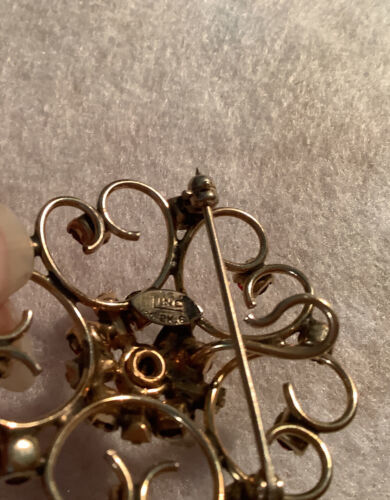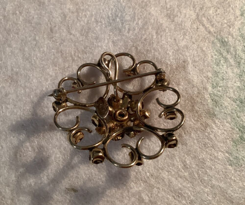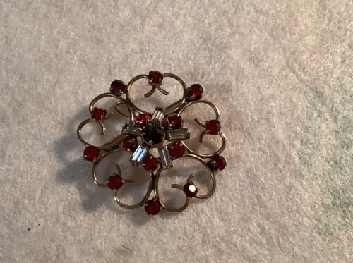 Vintage Filigree Pin or Pendant Linc 1/20 12K GF. Preowned in very good condition. 1 1/4 inch in diameter. Gold filled metal with round red rhinestones and a few clear rectangular rhinestones in the center. The photo don?t do them justice-they really sparkle in the light. Feel free to email with questions. I do combine shipping on multiple purchases. Have a great day!
