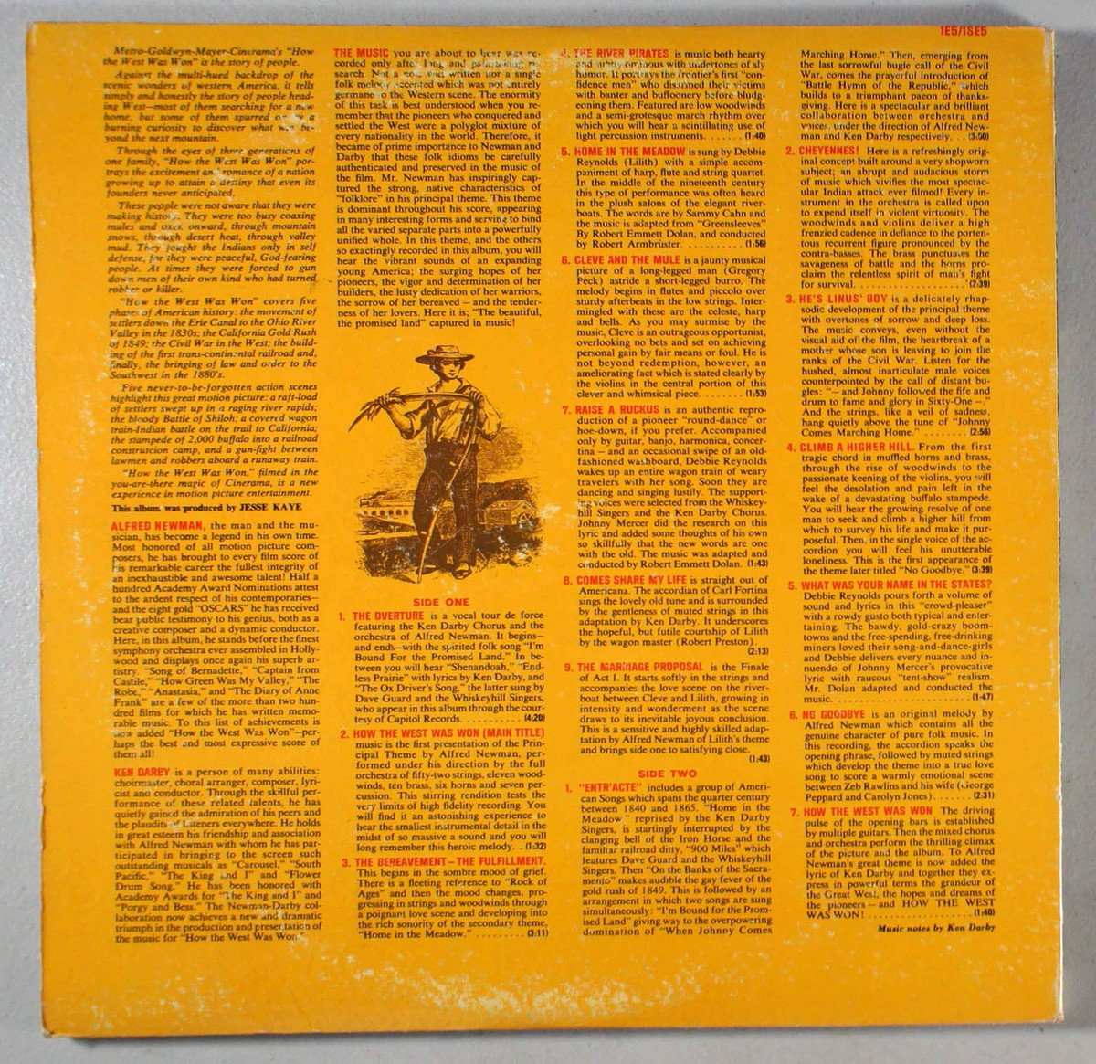 The How the West Was Won soundtrack album contains multiple elements. There is Alfred Newman's orchestral score, paced by the big, heroic Western title theme that gets used in a variety of different moods throughout. The score is widely considered to be one of Newman's best, and appears on the AFI's 100 Years of Film Scores list. It was nominated for the Academy Award for Best Original Score. And there is Debbie Reynolds, whose starring role traverses the entire narrative, and who gets an opportunity to sing several traditional songs, including Home in the Meadow, to the tune of Greensleeves, Raise a Ruckus, and What Was Your Name in the States?, with newly written lyrics by Sammy Cahn and Johnny Mercer.