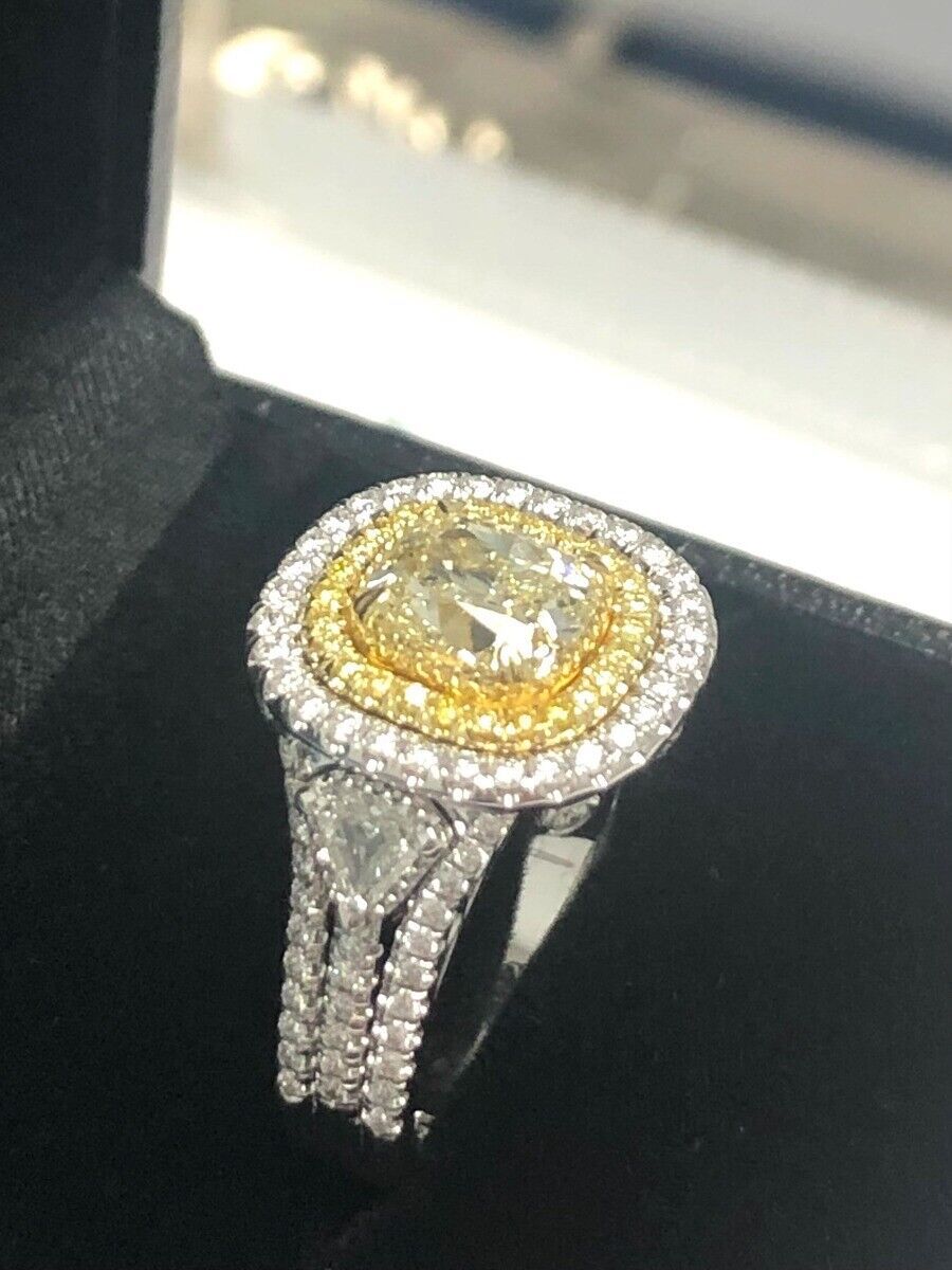 No many rings will get as much attention as this sparkler!! This beautiful one-of-a-kind engagement ring showcases a 1.81 carat GIA certified cushion brilliant cut natural fancy light grayish greenish yellow diamond surrounded by a double halo of sparkling round cut colorless and yellow diamonds. Additional diamonds continue down the three row shank with 2 shield cut side colorless diamonds and the detailing on the gallery, creating a shimmering look of this ring. Handcrafted in 18-karat two-tone gold and completed with a high polish finish. The total carat weight is 3.08 carats.
