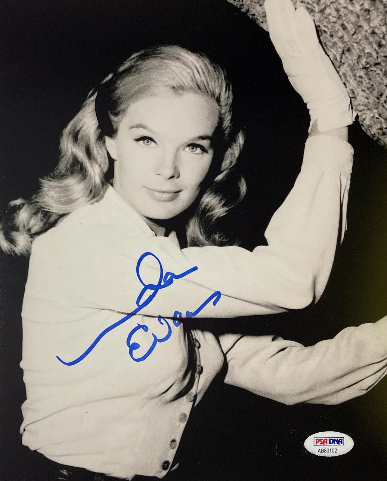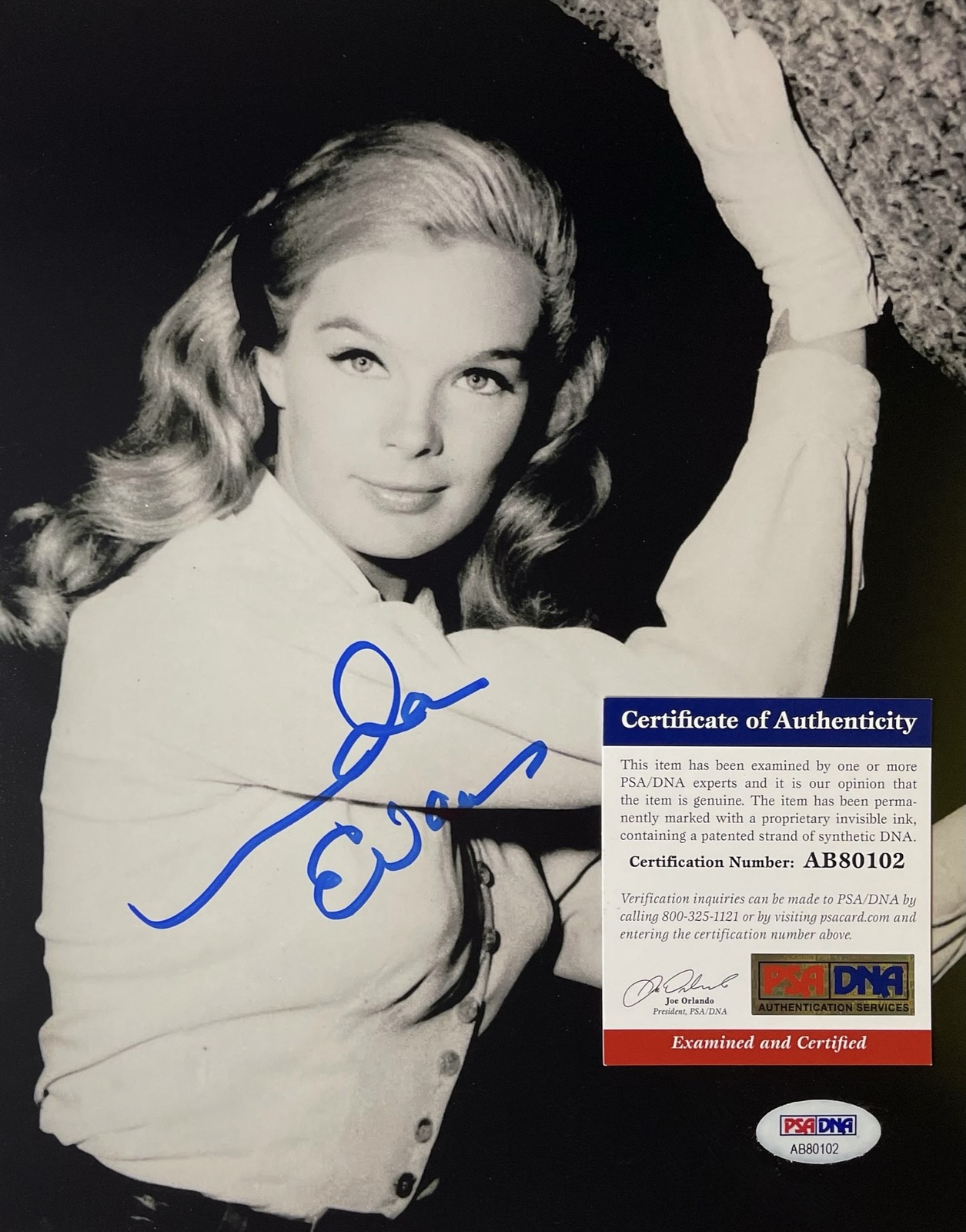 Linda Evans autographed 8" x 10" photo hand signed in blue felt tip marker. This signature has been authenticated by PSA/DNA authentication Certification Number: AB80102 and will come with the matching cert card you see in the scans. Linda Evans is an American actress. Known for The Big Valley (1965-1969), Dynasty (1981-1989), Banacek (1972-1974), Those Calloways (1965), Tom Horn (1980), Childish Things (1969), Twilight of Honor (1963), Beach Blanket Bingo (1965), and others. This photo will come in a clear hard top load for display. Buy with confidence we have been selling in-person autographs since 1992. TV Shows Hollywood