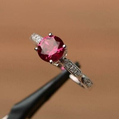 Anillo de compromiso con solitario de rubí rosado CZ de corte redondo de 2...
