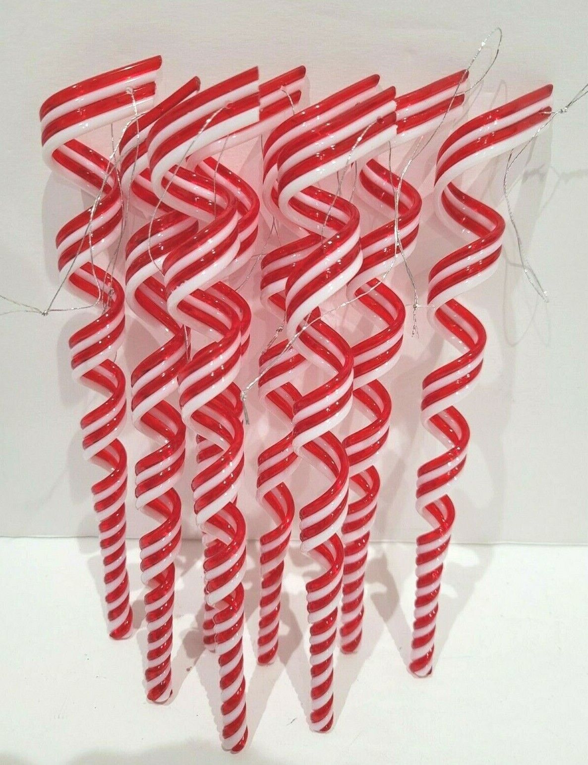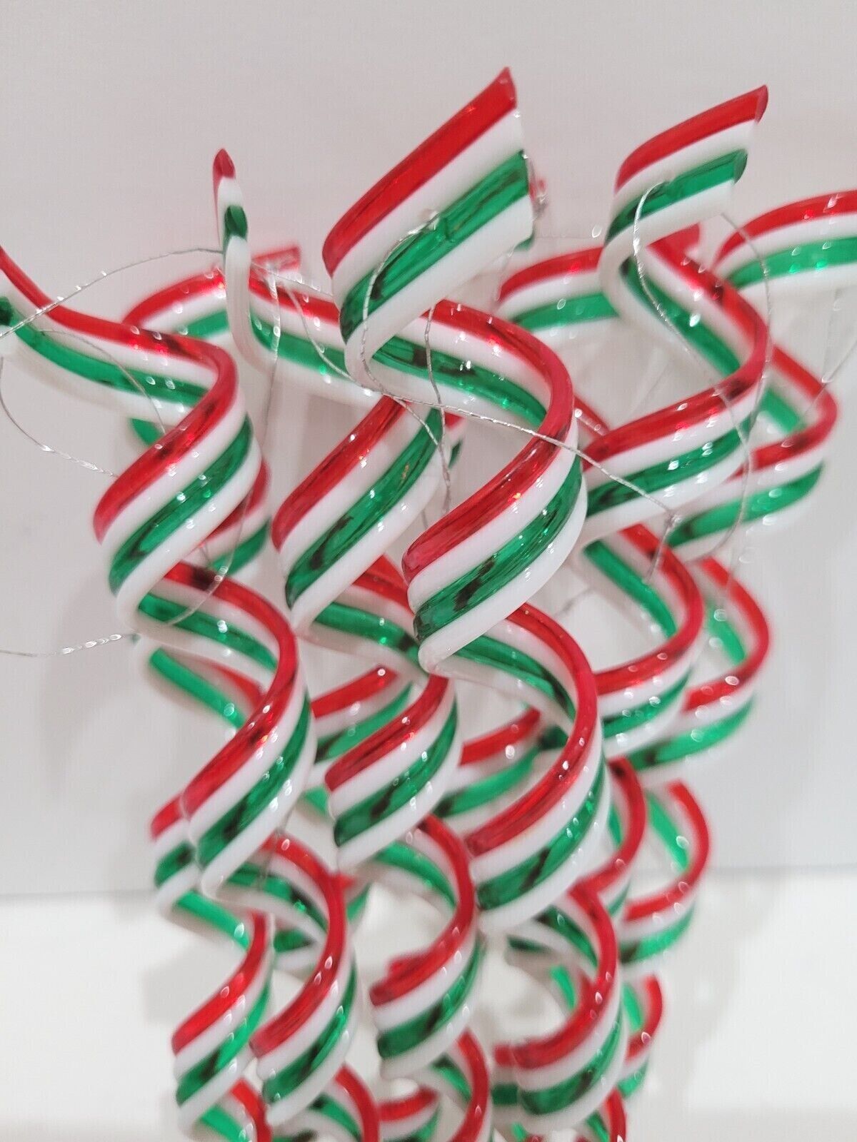 Up for sale we have a set of (8) adorable green, red and white swirl candy ornaments for your Christmas tree, Wreath or Garland. These ornaments are so cute they made of plastic and have a swirl to them. These measure approx 6.75" tall. I also have these in all red/white combination. I have many ornaments that would look great with these (see last few picture).
